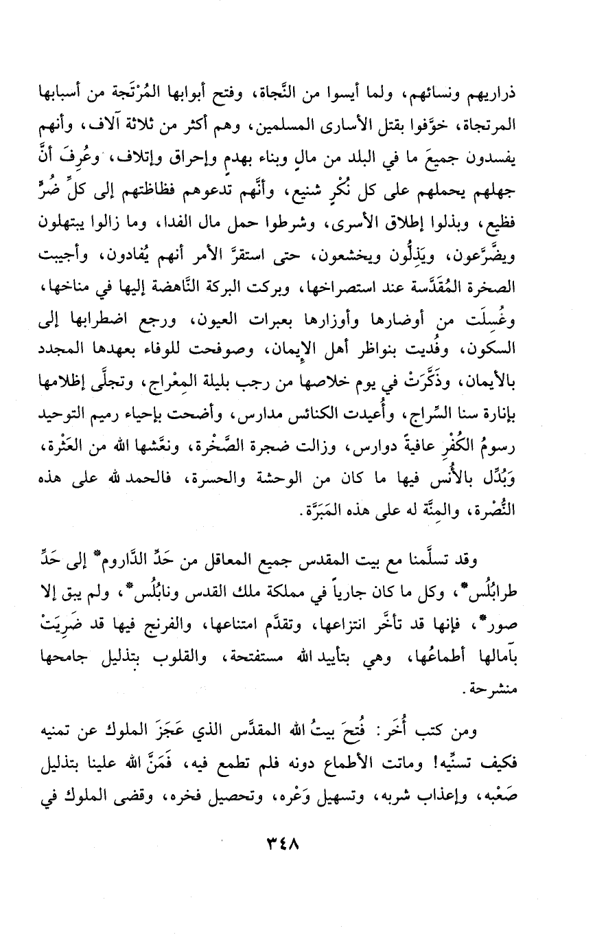 ذَرَارِيهمْ وَنِسَائِهِمْ وَلما أيسوا من النجَاة وَفتح أَبْوَابهَا المرتجة من أَسبَابهَا المرتجاة خوفوا بقتل الْأُسَارَى الْمُسلمين وهم أَكثر من ثَلَاثَة آلَاف وَأَنَّهُمْ يفسدون جَمِيع مَا فِي الْبَلَد من مَال وَبِنَاء بهدم وإحراق وَإِتْلَاف وَعرف أَن جهلهم على كل نكر شنيع وَأَنَّهُمْ تدعوهم فظاظتهم إِلَى كل ضرّ فظيع وبذلوا إِطْلَاق الأسرى وشرطوا حمل مَال الفدا وَمَا زَالُوا يبتهلون ويضرعون ويذلون ويخشعون حَتَّى اسْتَقر الْأَمر أَنهم يفادون وأجيبت الصَّخْرَة المقدسة عِنْد استصراخها وبركت الْبركَة الناهضة إِلَيْهَا فِي مناخها وغسلت من أوضارها وأوزارها بعبرات الْعُيُون وَرجع اضطرابها إِلَى السّكُون وفديت بنواظر أهل الْإِيمَان وصوفحت للوفاء بعهدها المجدد بالأيمان وَذكرت فِي يَوْم خلاصها من رَجَب بليلة الْمِعْرَاج وتجلى إظلامها بإنارة سنا السراج وأعيدت الْكَنَائِس مدارس وأضحت بإحياء رَمِيم التَّوْحِيد رسوم الْكفْر عَافِيَة دوارس وزالت ضجرة الصَّخْرَة ونعشها الله من العثرة وَبدل بالأنس فِيهَا مَا كَانَ من الوحشة وَالْحَسْرَة فَالْحَمْد لله على هَذِه النُّصْرَة والْمنَّة لَهُ على هَذِه المبرة