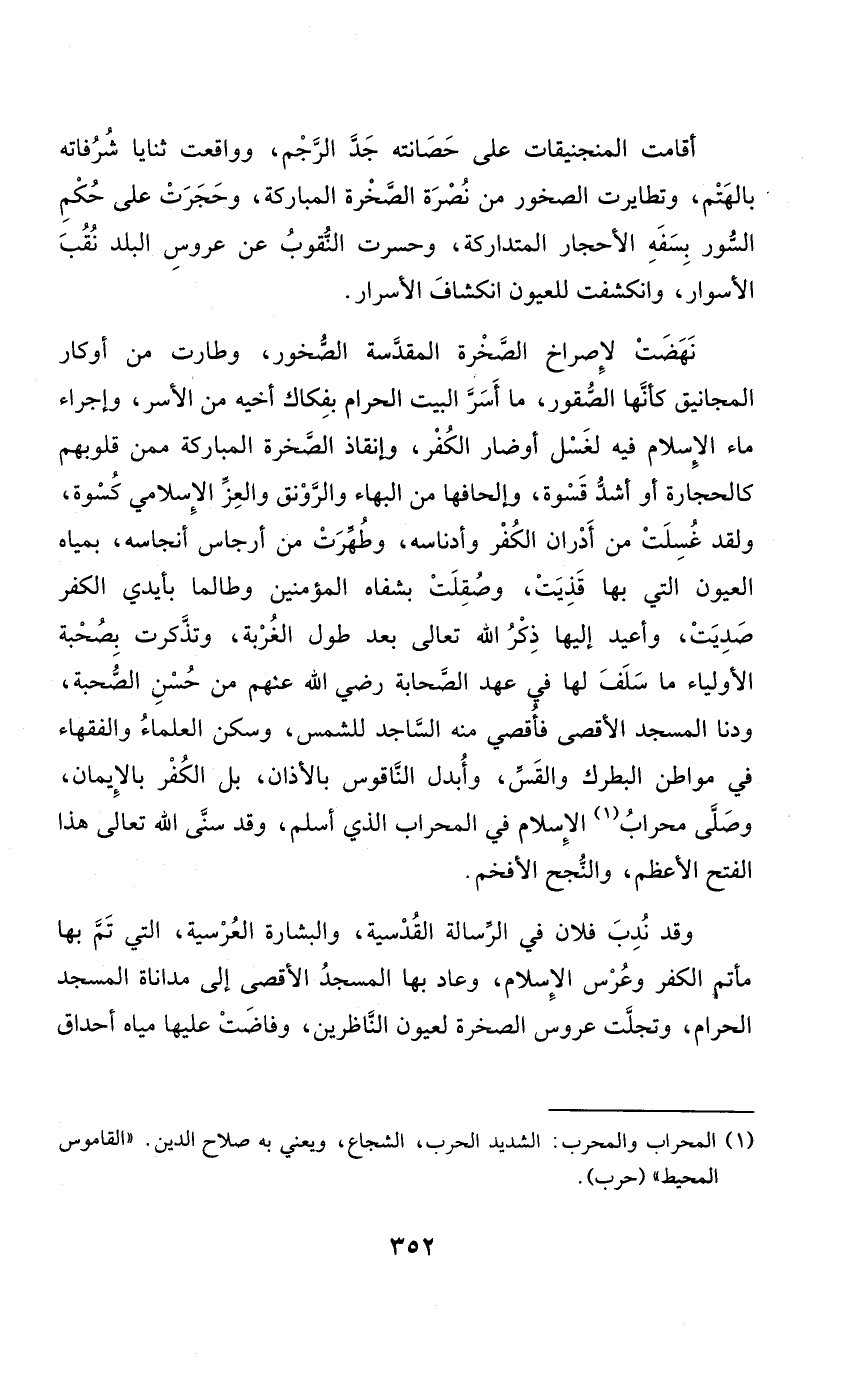 نهضت لإصراخ الصَّخْرَة المقدسة الصخور وطارت من أوكار المجانيق كَأَنَّهَا الصقور مَا أسر الْبَيْت الْحَرَام بفكاك أَخِيه من الْأسر وإجراء مَاء الْإِسْلَام فِيهِ لغسل أوضار الْكفْر وإنقاذ الصَّخْرَة الْمُبَارَكَة مِمَّن قُلُوبهم كالحجارة أَو أَشد قسوة وإلحافها من الْبَهَاء والرونق والعز الإسلامي كسْوَة وَلَقَد غسلت من أدران الْكفْر وأدناسه وطهرت من أرجاس أنجاسه بمياه الْعُيُون الَّتِي بهَا قذفت وصقلت بشفاه الْمُؤمنِينَ وطالما بأيدي الْكفْر صديت وأعيد إِلَيْهَا ذكر الله تَعَالَى بعد طول الغربة وتذكرت بِصُحْبَة الاولياء مَا سلف لَهَا فِي عهد الصَّحَابَة رَضِي الله عَنْهُم من حسن الصُّحْبَة ودنا الْمَسْجِد الْأَقْصَى فأقصي مِنْهُ الساجد للشمس وَسكن الْعلمَاء وَالْفُقَهَاء فِي مَوَاطِن البطرك والقس وأبدل الناقوس بِالْأَذَانِ بل الْكفْر بِالْإِيمَان وَصلى محراب الْإِسْلَام فِي الْمِحْرَاب الَّذِي أسلم وَقد سنى الله تَعَالَى هَذَا الْفَتْح الْأَعْظَم والنجح الأفخم