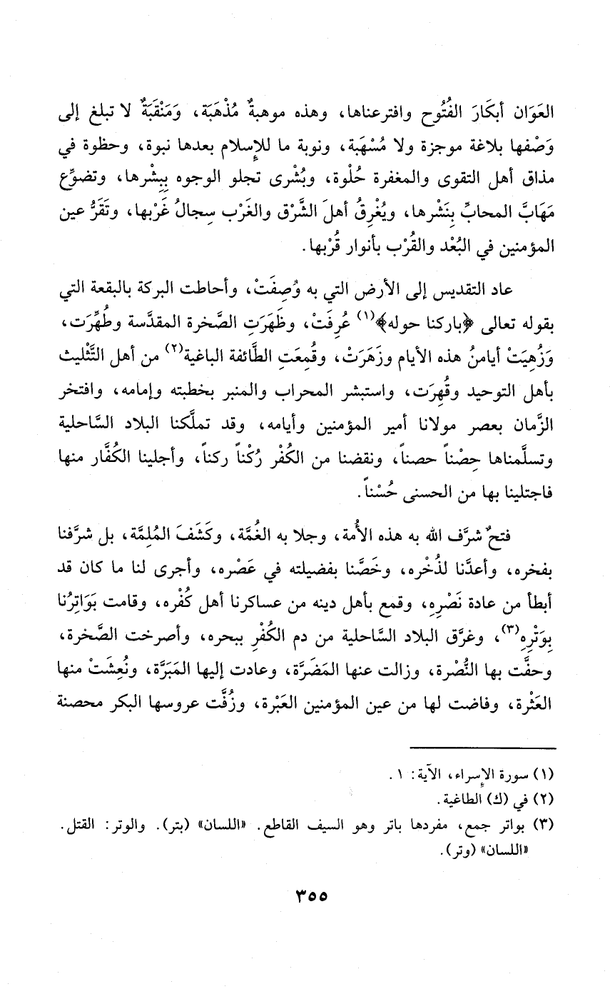 عَاد التَّقْدِيس إِلَى الأَرْض الَّتِي بِهِ وصفت وأحاطت الْبركَة بالبقعة الَّتِي بقوله تَعَالَى {باركنا حوله} عرفت وَظَهَرت الصَّخْرَة المقدسة وطهرت وزهيت أيامن هَذِه الْأَيَّام وزهرت وقمعت الطَّائِفَة الباغية من أهل التَّثْلِيث بِأَهْل التَّوْحِيد وقهرت واستبشر الْمِحْرَاب والمنبر بخطبته وإمامه وافتخر الزَّمَان بعصر مَوْلَانَا أَمِير الْمُؤمنِينَ وأيامه وَقد تملكنا الْبِلَاد الساحلية وتسلمناها حصنا حصنا ونقضنا من الْكفْر ركنا ركنا وأجلينا الْكفَّار مِنْهَا فاجتلينا بهَا من الْحسنى حسنا