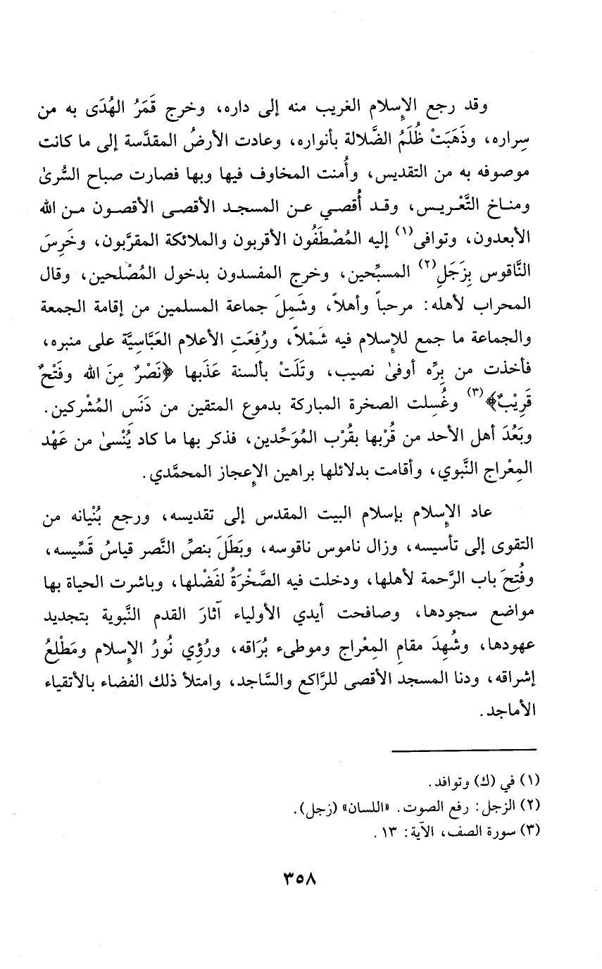 عَاد الْإِسْلَام بِإِسْلَام الْبَيْت الْمُقَدّس إِلَى تقديسه وَرجع بُنْيَانه من التَّقْوَى إِلَى تأسيسة وَزَالَ ناموس ناقوسه وَبَطل بِنَصّ النَّصْر قِيَاس قسيسه وَفتح بَاب الرَّحْمَة لأَهْلهَا وَدخلت فِيهِ الصَّخْرَة لفضلها وباشرت الْحَيَاة بهَا مَوَاضِع سجودها وصافحت أَيدي الْأَوْلِيَاء آثَار الْقدَم النَّبَوِيَّة بتجديد عهودها وَشهد مقَام الْمِعْرَاج وموطئ براقه ورؤيء نور الْإِسْلَام ومطلع إشراقه ودنا الْمَسْجِد الْأَقْصَى للراكع والساجد وامتلأ ذَلِك الفضاء بالأتقياء الأماجد
