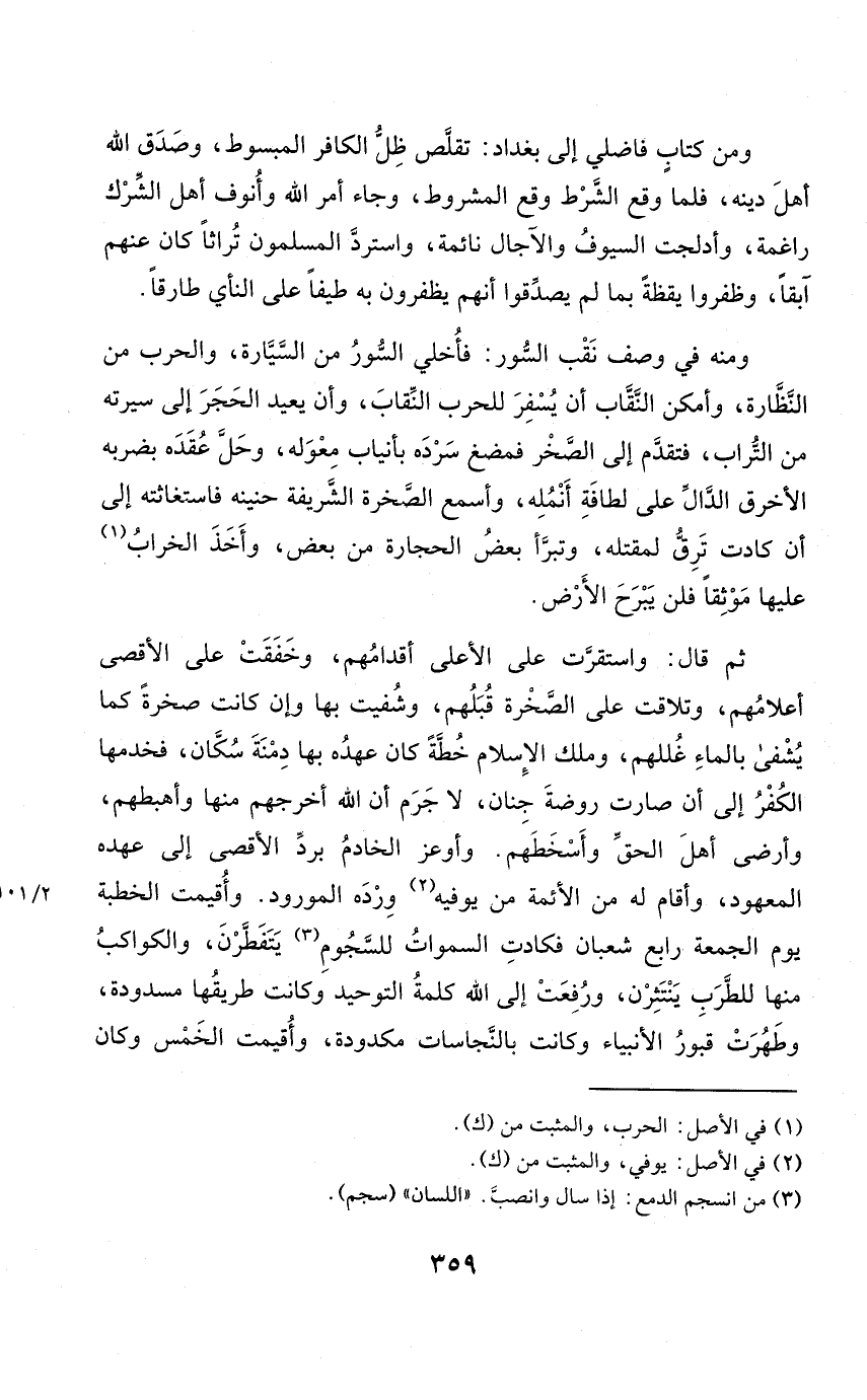 ثمَّ قَالَ واستقرت على الْأَعْلَى أَقْدَامهم وخفقت على الْأَقْصَى أعلامهم وتلاقت على الصَّخْرَة قبلهم وشفيت بهَا وَإِن كَانَت صَخْرَة كَمَا يشفى بِالْمَاءِ غللهم وَملك الْإِسْلَام خطة كَانَ عَهده بهَا دمنة سكان فخدمها الْكفْر إِلَى أَن صَارَت رَوْضَة جنان لَا جرم أَن الله أخرجهم مِنْهَا وأهبطهم وأرضى أهل الْحق وأسخطهم وأوعز الْخَادِم برد الْأَقْصَى إِلَى عَهده الْمَعْهُود وَأقَام لَهُ من الْأَئِمَّة من يُوفيه ورده المورود وأقيمت الْخطْبَة يَوْم الْجُمُعَة رَابِع شعْبَان فَكَادَتْ السَّمَوَات للسجوم يتفطرن وَالْكَوَاكِب مِنْهَا للطرب ينتثرن وَرفعت إِلَى الله كلمة التَّوْحِيد وَكَانَت طريقها مسدودة وطهرت قُبُور الْأَنْبِيَاء وَكَانَت بالنجاسات مكدودة وأقيمت الْخمس وَكَانَ