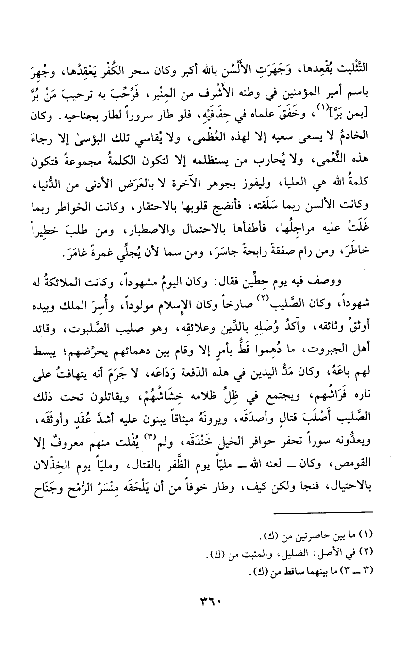 وَوصف فِيهِ يَوْم حطين فَقَالَ وَكَانَ الْيَوْم مشهودا وَكَانَت الْمَلَائِكَة لَهُ شُهُودًا وَكَانَ الصَّلِيب صَارِخًا وَكَانَ الْإِسْلَام مولودا وَأسر الْملك وَبِيَدِهِ أوثق وثائقه وآكد وَصله بِالدّينِ وعلائقه وَهُوَ صَلِيب الصلبوت وقائد أهل الجبروت مَا دهموا قطّ بِأَمْر إِلَّا وَقَامَ بَين دهمائهم يحرضهم يبسط لَهُم بَاعه وَكَانَ مد الْيَدَيْنِ فِي هَذِه الدفعة وداعه لَا جرم أَنه يتهافت على ناره فراشهم ويجتمع فِي ظلّ ظلامه خشاشهم ويقاتلون تَحت ذَلِك الصَّلِيب أَصْلَب قتال وأصدقه ويرونه ميثاقا يبنون عَلَيْهِ أَشد عقد وأوثقه ويعدونه سورا تحفر حوافر الْخَيل خندقه وَلم يفلت مِنْهُم مَعْرُوف إِلَّا القومص وَكَانَ لَعنه الله مَلِيًّا يَوْم الظفر بِالْقِتَالِ ومليا يَوْم الخذلان بالاحتيال فنجا وَلَكِن كَيفَ وطار خوفًا من أَن يلْحقهُ منسر الرمْح وَجَنَاح