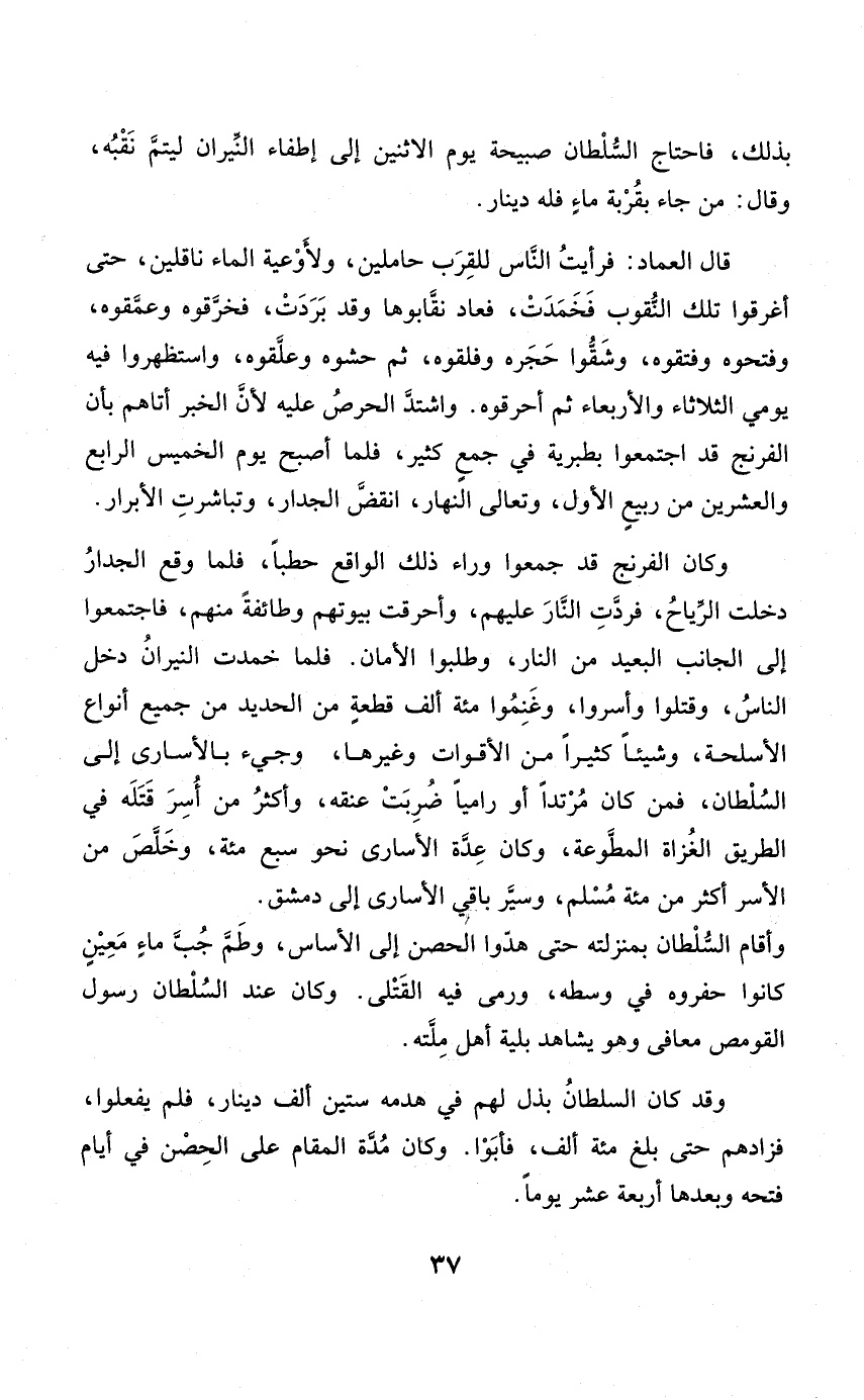 وَأقَام السُّلْطَان بِمَنْزِلَتِهِ حَتَّى هُدُوا الْحصن إِلَى الأساس وطم جب مَاء معِين كَانُوا حفروه فِي وَسطه وَرمى فِيهِ الْقَتْلَى