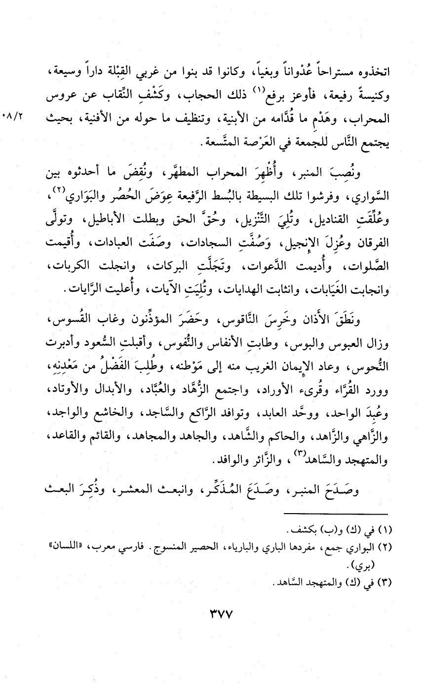 ونطق الْأَذَان وخرس الناقوس وَحضر المؤذنون وَغَابَ القسوس وَزَالَ العبوس والبوس وَطَابَتْ الأنفاس والنفوس وَأَقْبَلت السُّعُود وأدبرت النحوس وَعَاد الْإِيمَان الْغَرِيب مِنْهُ إِلَى موطنه وَطلب الْفضل من معدنه وَورد الْقُرَّاء وقرئ الأوراد وَاجْتمعَ الزهاد والعباد والأبدال والأوتاد وَعبد الْوَاحِد ووحد العابد وتوافد الرَّاكِع والساجد والخاشع والواجد والزاهي والزاهد وَالْحَاكِم وَالشَّاهِد والجاهد والمجاهد والقائم والقاعد والمتهجد والساهد والزائر والوافد