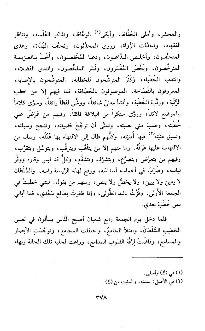 وَمَا مِنْهُم إِلَّا من يتأهب ويترقب ويتوسل ويتقرب وَفِيهِمْ من يتَعَرَّض ويتضرع ويتشوف ويتشفع وكل قد لبس وقاره وَوقر لِبَاسه وَضرب فِي أخماسه أسداسه وَرفع لهَذِهِ الرياسة راسه وَالسُّلْطَان لَا يعين وَلَا يبين وَلَا يخص وَلَا ينص وَمِنْهُم من يَقُول لَيْتَني خطبت فِي الْجُمُعَة الأولى وفزت بِالْيَدِ الطُّولى وَإِذا ظَفرت بطالع سعدي فَمَا أُبَالِي بِمن خطب بعدِي
