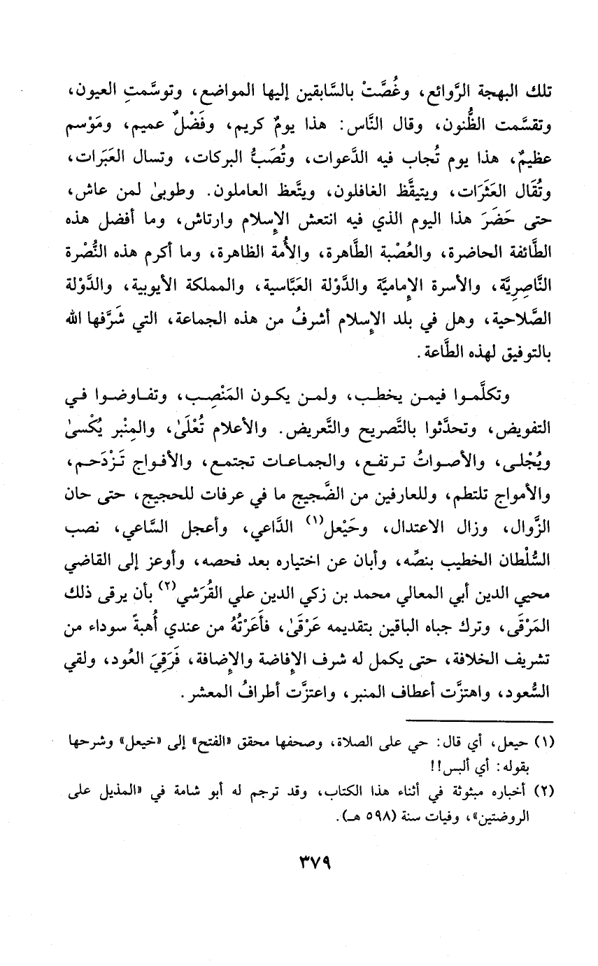 تِلْكَ الْبَهْجَة الروائع وغصت بالسابقين إِلَيْهَا الْمَوَاضِع وتوسمت الْعُيُون وتقسمت الظنون وَقَالَ النَّاس هَذَا يَوْم كريم وَفضل عميم وموسم عَظِيم هَذَا يَوْم تجاب فِيهِ الدَّعْوَات وتصب البركات وتسال العبرات وتقال العثرات ويتيقظ الغافلون ويتعظ الْعَامِلُونَ وطوبى لمن عَاشَ حَتَّى حضر هَذَا الْيَوْم الَّذِي فِيهِ انْتَعش الْإِسْلَام وارتاش وَمَا أفضل هَذِه الطَّائِفَة الْحَاضِرَة والعصبة الطاهرة وَالْأمة الظَّاهِرَة وَمَا أكْرم هَذِه النُّصْرَة الناصرية والأسرة الإمامية والدولة العباسية والمملكة الأيوبية والدولة الصلاحية وَهل فِي بلد الْإِسْلَام أشرف من هَذِه الْجَمَاعَة الَّتِي شرفها الله بالتوفيق لهَذِهِ الطَّاعَة
