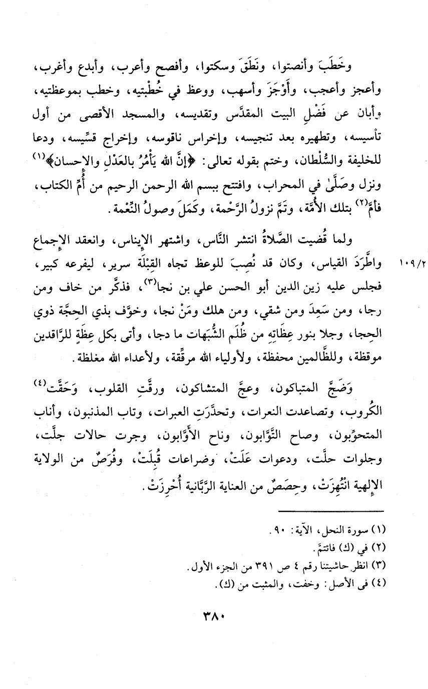 وخطب وأنصتوا ونطق وسكتوا وأفصح وأعرب وأبدع وَأغْرب وأعجز وأعجب وأوجز وأسهب وَوعظ فِي خطبتيه وخطب بموعظتيه وَأَبَان عَن فضل الْبَيْت الْمُقَدّس وتقديسه وَالْمَسْجِد الْأَقْصَى من أول تأسيسه وتطهيره بعد تنجيسه وإخراس ناقوسه وَإِخْرَاج قسيسه ودعا للخليفة وَالسُّلْطَان وَختم بقوله تَعَالَى {إِن الله يَأْمر بِالْعَدْلِ وَالْإِحْسَان} وَنزل وَصلى فِي الْمِحْرَاب وافتتح بِبسْم الله الرَّحْمَن الرَّحِيم من أم الْكتاب فَأم بِتِلْكَ الْأمة وَتمّ نزُول الرَّحْمَة وكمل وُصُول النِّعْمَة