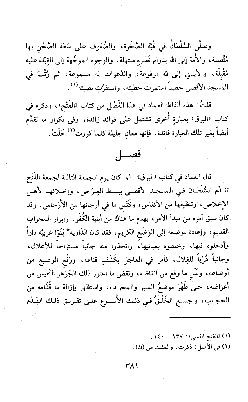 وَصلى السُّلْطَان فِي قبَّة الصَّخْرَة والصفوف على سَعَة الصحن بهَا مُتَّصِلَة وَالْأمة إِلَى الله بدوام نَصره مبتهلة وَالْوُجُوه الموجهة إِلَى الْقبْلَة عَلَيْهِ مقبلة وَالْأَيْدِي إِلَى الله مَرْفُوعَة والدعوات لَهُ مسموعة ثمَّ رتب فِي الْمَسْجِد الْأَقْصَى خَطِيبًا استمرت خطبَته واستقرت نصبته