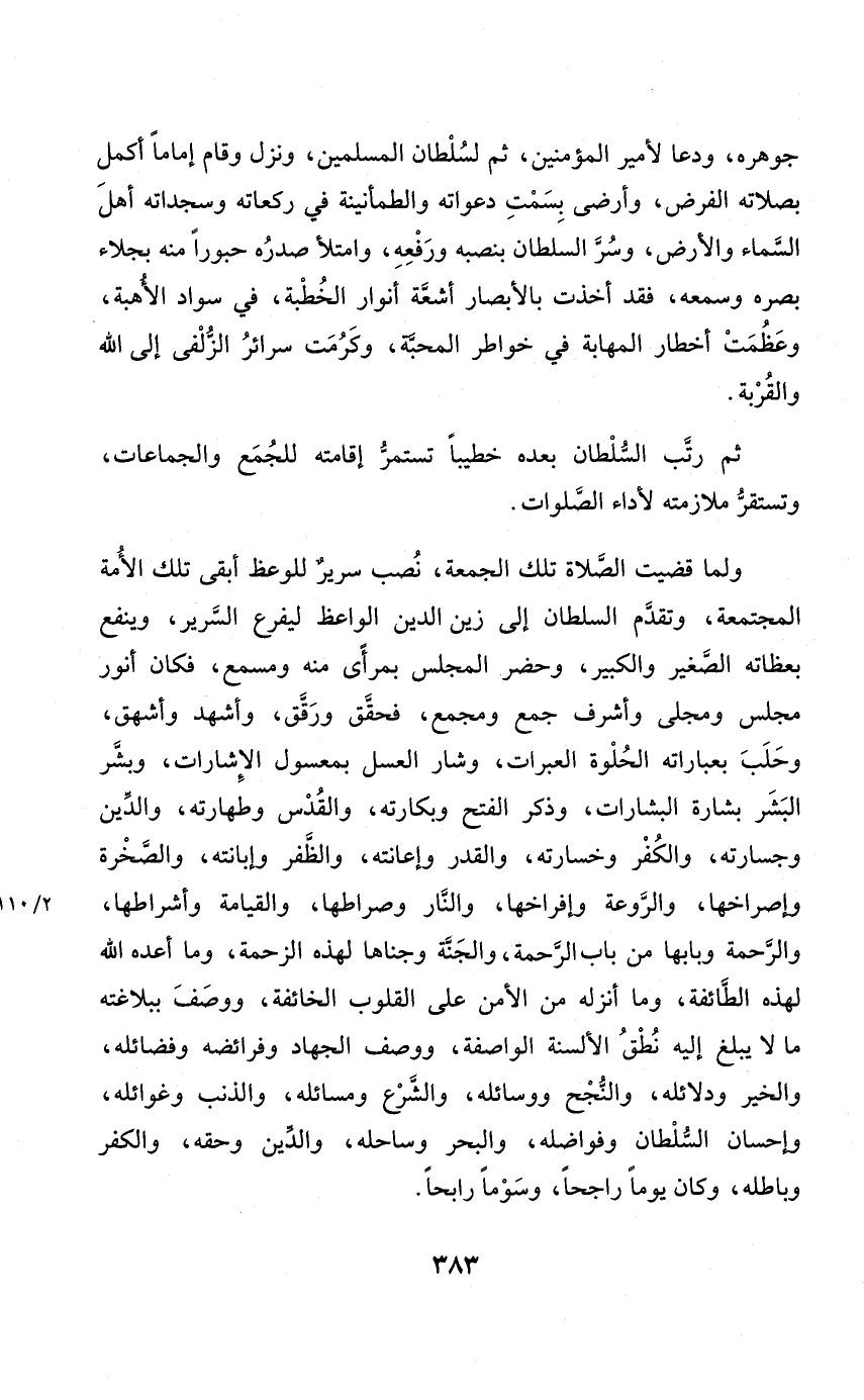 وَلما قضيت الصَّلَاة تِلْكَ الْجُمُعَة نصب سَرِير للوعظ أبقى تِلْكَ الْأمة المجتمعة وَتقدم السُّلْطَان إِلَى زين الدّين الْوَاعِظ ليفرع السرير وينفع بعظاته الصَّغِير وَالْكَبِير وَحضر الْمجْلس بمرأى مِنْهُ ومسمع فَكَانَ أنور مجْلِس ومجلى وأشرف جمع وَمجمع فحقق ورقق وَأشْهد وأشهق وحلب بعباراته الحلوة العبرات وشار الْعَسَل بمعسول الإشارات وَبشر الْبشر بِشَارَة البشارات وَذكر الْفَتْح وبكارته والقدس وطهارته وَالدّين وجسارته وَالْكفْر وخسارته وَالْقدر وإعانته وَالظفر وإبانته والصخرة وإصراخها والروعة وإفراخها وَالنَّار وصراطها وَالْقِيَامَة وأشراطها وَالرَّحْمَة وبابها من بَاب الرَّحْمَة وَالْجنَّة وجناها لهَذِهِ الزحمة وَمَا أعده الله لهَذِهِ الطَّائِفَة وَمَا أنزلهُ من الْأَمْن على الْقُلُوب الخائفة وَوصف ببلاغته مَا لَا يبلغ إِلَيْهِ نطق الْأَلْسِنَة الواصفة وَوصف الْجِهَاد وفرائضه وفضائله وَالْخَيْر ودلائله والنجح ووسائله وَالشَّرْع ومسائله والذنب وغوائله وإحسان السُّلْطَان وفواضله وَالْبَحْر وساحله وَالدّين وَحقه وَالْكفْر وباطله وَكَانَ يَوْمًا راجحا وسوما رابحا