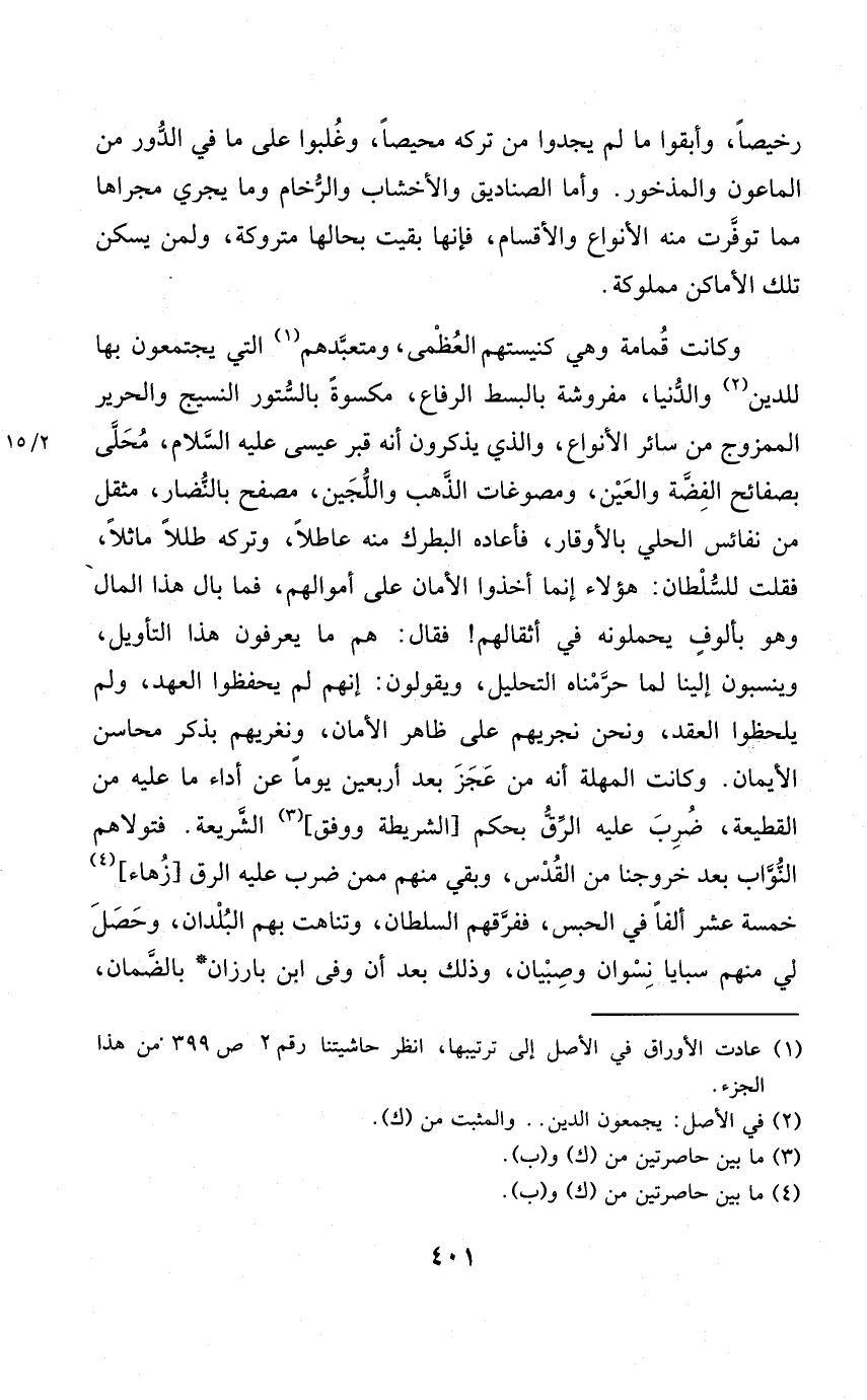 وَكَانَت قمامة وَهِي كنيستهم الْعُظْمَى ومتعبدهم الَّتِي يَجْتَمعُونَ بهَا للدّين وَالدُّنْيَا مفروشة بالبسط الرفاع مكسوة بالستور النسيج وَالْحَرِير الممزوج من سَائِر الْأَنْوَاع وَالَّذِي يذكرُونَ أَنه قبر عِيسَى عَلَيْهِ السَّلَام محلى بصفائح الْفضة وَالْعين ومصوغات الذَّهَب واللجين مصفح بالنضار مثقل من نفائس الْحلِيّ بالأوقار فَأَعَادَهُ البطرك مِنْهُ عاطلا وَتَركه طللا ماثلا فَقلت للسُّلْطَان هَؤُلَاءِ إِنَّمَا أخذُوا الْأمان على أَمْوَالهم فَمَا بَال هَذَا المَال وَهُوَ بألوف يحملونه فِي أثقالهم فَقَالَ هم مَا يعْرفُونَ هَذَا التَّأْوِيل وينسبون إِلَيْنَا لما حرمناه التَّحْلِيل وَيَقُولُونَ إِنَّهُم لم يحفظوا الْعَهْد وَلم يلحظوا العقد وَنحن نجريهم على ظَاهر الْأمان ونغريهم بِذكر محَاسِن الْإِيمَان وَكَانَت المهلة أَنه من عجز بعد أَرْبَعِينَ يَوْمًا عَن أَدَاء مَا عَلَيْهِ من القطيعة ضرب عَلَيْهِ الرّقّ بِحكم الشريطة ووفق الشَّرِيعَة فتولاهم النواب بعد خروجنا من الْقُدس وَبَقِي مِنْهُم مِمَّن ضرب عَلَيْهِ الرّقّ زهاء خَمْسَة عشر ألفا فِي الْحَبْس ففرقهم السُّلْطَان وَتَنَاهَتْ بهم الْبلدَانِ وَحصل لي مِنْهُم سَبَايَا نسوان وصبيان وَذَلِكَ بعد أَن وفى ابْن بارزان بِالضَّمَانِ