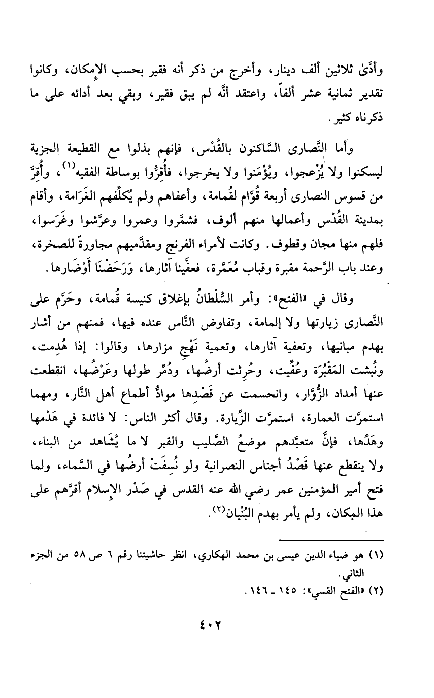 وَأما النَّصَارَى الساكنون بالقدس فَإِنَّهُم بذلوا مَعَ القطيعة الْجِزْيَة ليسكنوا وَلَا يزعجوا ويؤمنوا وَلَا يخرجُوا فأقروا بِوَاسِطَة الْفَقِيه وَأقر من قسوس النَّصَارَى أَرْبَعَة قوام لقمامة وأعفاهم وَلم يكلفهم الغرامة وَأقَام بِمَدِينَة الْقُدس وأعمالها مِنْهُم أُلُوف فشمروا وعمروا وعرشوا وغرسوا فَلهم مِنْهَا مجان وقطوف وَكَانَت لأمراء الفرنج ومقدميهم مجاورة للصخرة وَعند بَاب الرَّحْمَة مَقْبرَة وقباب معمرة فعفينا آثارها ورحضنا أوضارها