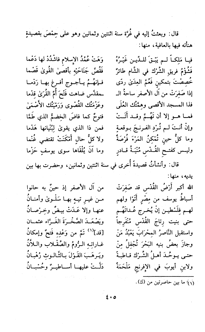 قَالَ وَبعثت إِلَيْهِ فِي غرَّة سنة اثْنَتَيْنِ وَثَمَانِينَ وَهُوَ على حمص بقصيدة هناته فِيهَا بالعافية مِنْهَا