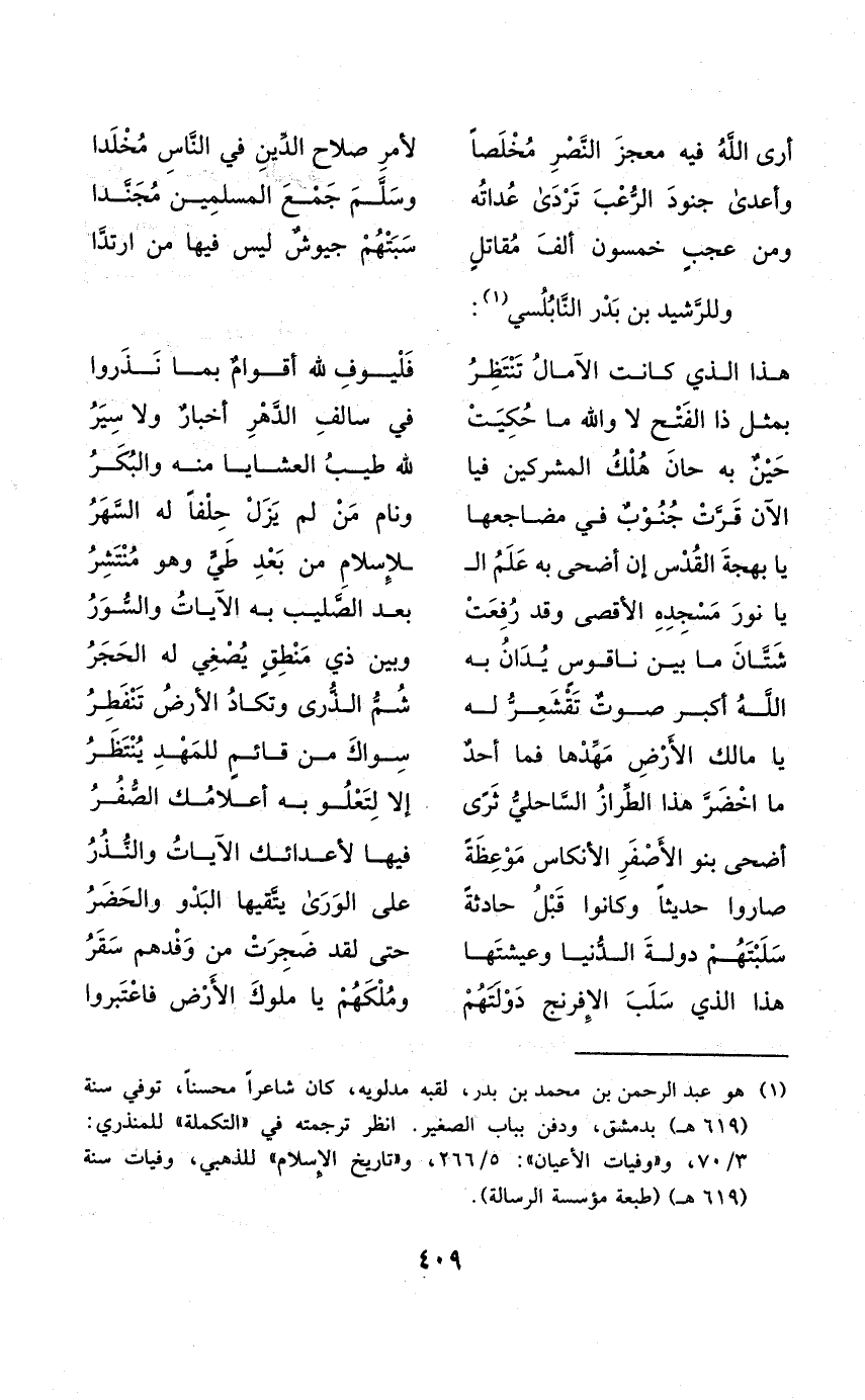 (يَا بهجة الْقُدس إِن أضحى بِهِ علم ... الْإِسْلَام من بعد طي وَهُوَ منتشر)