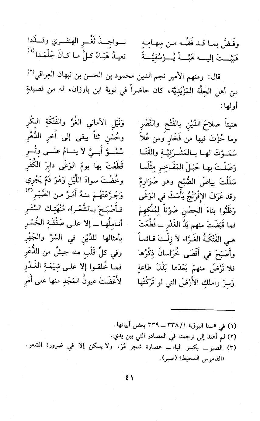 قَالَ وَمِنْهُم الْأَمِير نجم الدّين مَحْمُود بن الْحسن بن نَبهَان الْعِرَاقِيّ من أهل الْحلَّة المزيدية كَانَ حَاضرا فِي نوبَة ابْن بارزان لَهُ من قصيدة أَولهَا