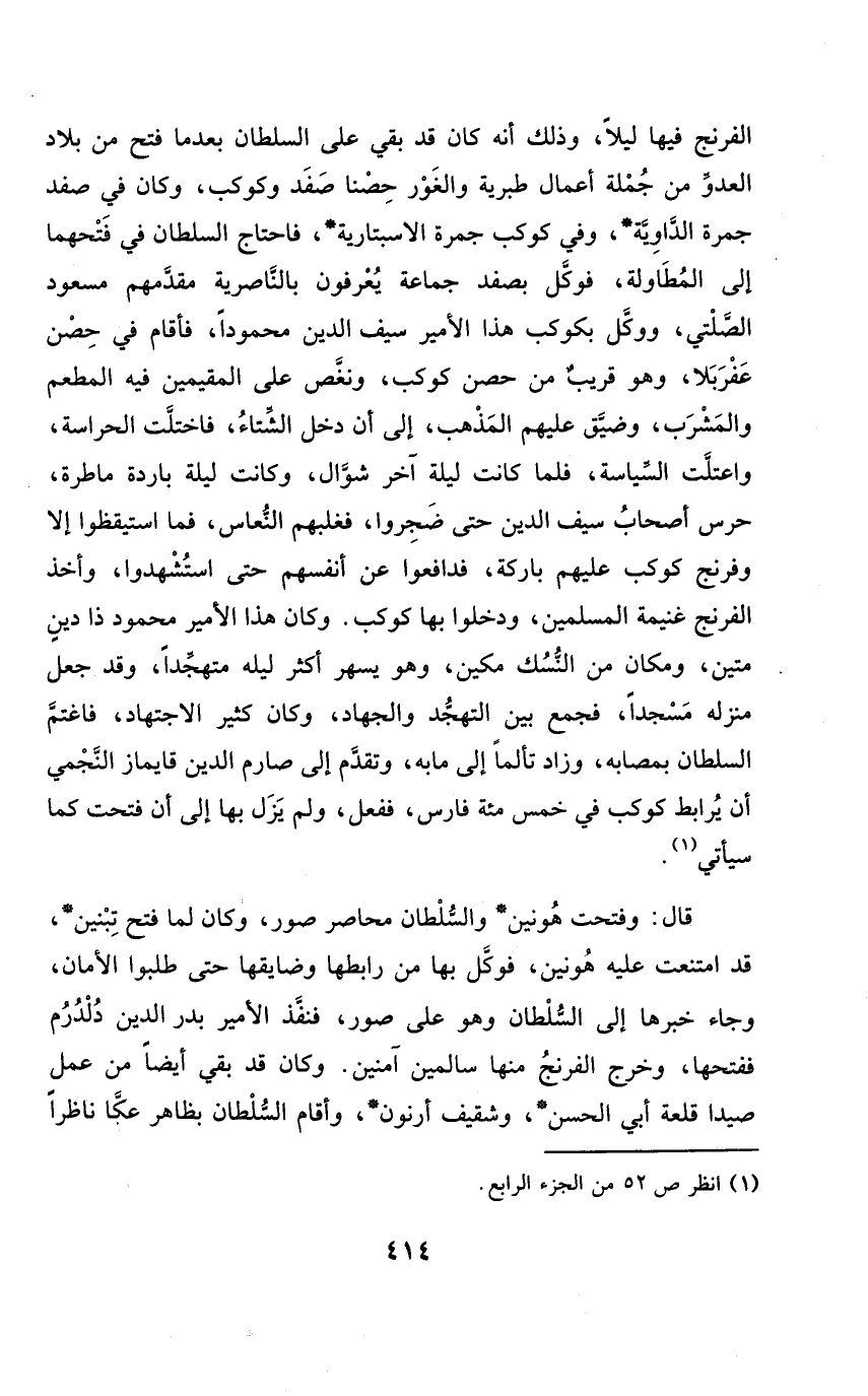 الفرنج فِيهَا لَيْلًا وَذَلِكَ أَنه كَانَ قد بَقِي على السُّلْطَان بَعْدَمَا فتح من بِلَاد الْعَدو من جملَة أَعمال طبرية والغور حصنا صفد وكوكب وَكَانَ فِي صفد جَمْرَة الداوية وَفِي كَوْكَب جَمْرَة الاسبتارية فَاحْتَاجَ السُّلْطَان فِي فتحهما إِلَى المطاولة فَوكل بصفد جمَاعَة يعْرفُونَ بالناصرية مقدمهم مَسْعُود الصلتي ووكل بكوكب هَذَا الْأَمِير سيف الدّين مَحْمُودًا فَأَقَامَ فِي حصن عفربلا وَهُوَ قريب من حصن كَوْكَب ونغص على المقيمين فِيهِ الْمطعم وَالْمشْرَب وضيق عَلَيْهِم الْمَذْهَب إِلَى أَن دخل الشتَاء فاختلت الحراسة واعتلت السياسة فَلَمَّا كَانَت لَيْلَة آخر شَوَّال وَكَانَت بَارِدَة ماطرة حرس أَصْحَاب سيف الدّين حَتَّى ضجروا فَغَلَبَهُمْ النعاس فَمَا استيقظوا إِلَّا وفرنج كَوْكَب عَلَيْهِم باركة فدافعوا عَن أنفسهم حَتَّى اسْتشْهدُوا واخذ الفرنج غنيمَة الْمُسلمين ودخلوا بهَا كَوْكَب
