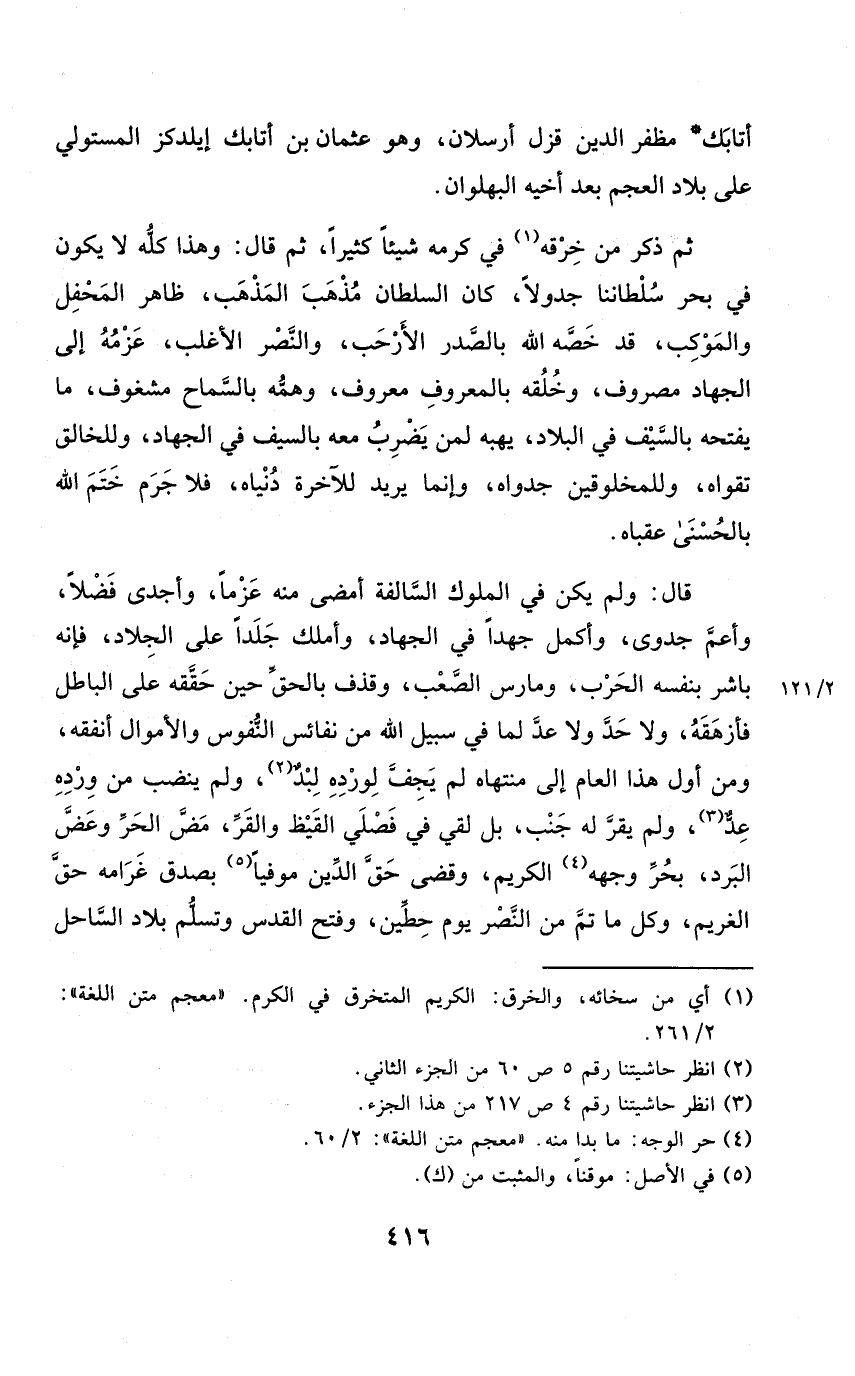 ثمَّ ذكر من خرقه فِي كرمه شَيْئا كثيرا ثمَّ قَالَ وَهَذَا كُله لَا يكون فِي بَحر سلطاننا جدولا كَانَ السُّلْطَان مَذْهَب الْمَذْهَب ظَاهر المحفل والموكب قد خصّه الله بالصدر الأرحب والنصر الْأَغْلَب عزمه إِلَى الْجِهَاد مَصْرُوف وخلقه بِالْمَعْرُوفِ مَعْرُوف وهمه بالسماح مشغوف مَا يَفْتَحهُ بِالسَّيْفِ فِي الْبِلَاد يَهبهُ لمن يضْرب مَعَه بِالسَّيْفِ فِي الْجِهَاد وللخالق تقواه وللمخلوقين جدواه وَإِنَّمَا يُرِيد للآخرة دُنْيَاهُ فَلَا جرم ختم الله بِالْحُسْنَى عقباه