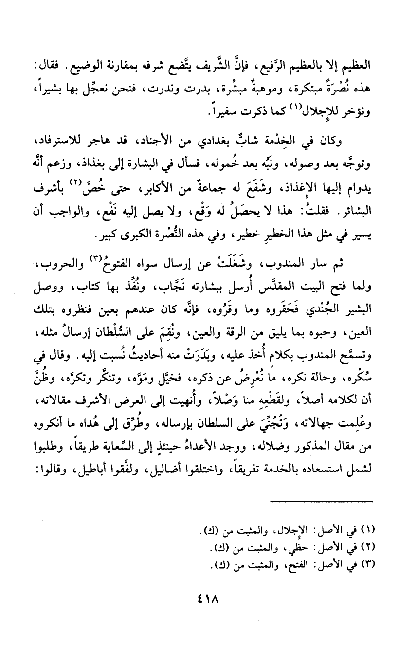 ثمَّ سَار الْمَنْدُوب وشغلت عَن إرْسَال سواهُ الْفتُوح والحروب وَلما فتح الْبَيْت الْمُقَدّس أرسل ببشارته نجاب وَنفذ بهَا كتاب وَوصل البشير الجندي فحقروه وَمَا وقروه فَإِنَّهُ كَانَ عِنْدهم بِعَين فنظروه بِتِلْكَ الْعين وحبوه بِمَا يَلِيق من الرقة وَالْعين ونقم على السُّلْطَان إرْسَال مثله وتسمح الْمَنْدُوب بِكَلَام أَخذ عَلَيْهِ وبدرت مِنْهُ أَحَادِيث نسبت إِلَيْهِ