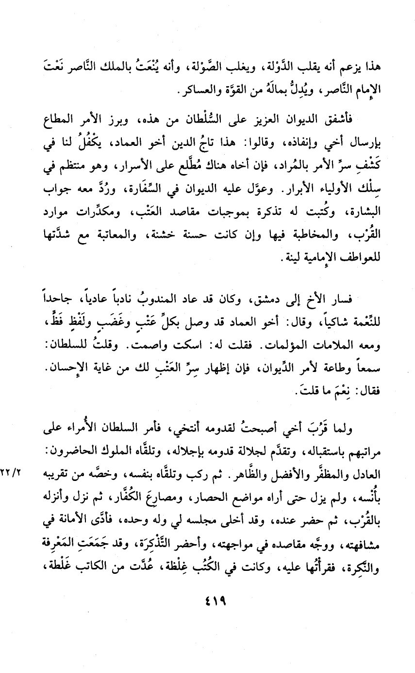 فأشفق الدِّيوَان الْعَزِيز على السُّلْطَان من هَذِه وبرز الْأَمر المطاع بإرسال أخي وإنفاذه وَقَالُوا هَذَا تَاج الدّين أَخُو الْعِمَاد يكفل لنا فِي كشف سر الْأَمر بالمراد فَإِن أَخَاهُ هُنَاكَ مطلع على الْأَسْرَار وَهُوَ مُنْتَظم فِي سلك الْأَوْلِيَاء الْأَبْرَار