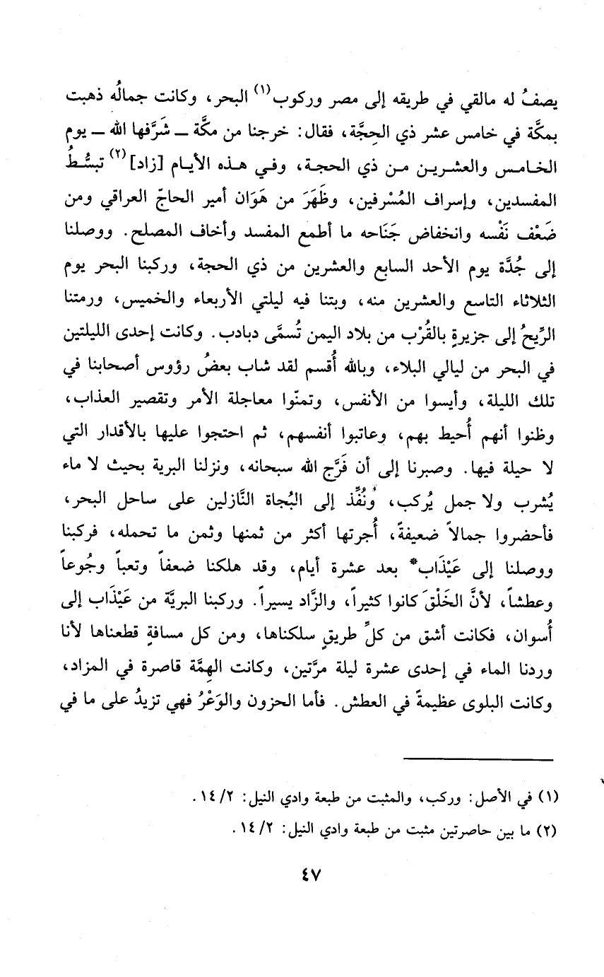يصف لَهُ مَا لَقِي فِي طَرِيقه إِلَى مصر وركوب الْبَحْر وَكَانَت جماله ذهبت بِمَكَّة فِي خَامِس عشر ذِي الْحجَّة فَقَالَ خرجنَا من مَكَّة شرفها الله يَوْم الْخَامِس وَالْعِشْرين من ذِي الْحجَّة وَفِي هَذِه الْأَيَّام زَاد تبسط المفسدين وإسراف المسرفين وَظهر من هوان أَمِير الْحَاج الْعِرَاقِيّ وَمن ضعف نَفسه وانخفاض جنَاحه مَا أطمع الْمُفْسد وأخاف المصلح
