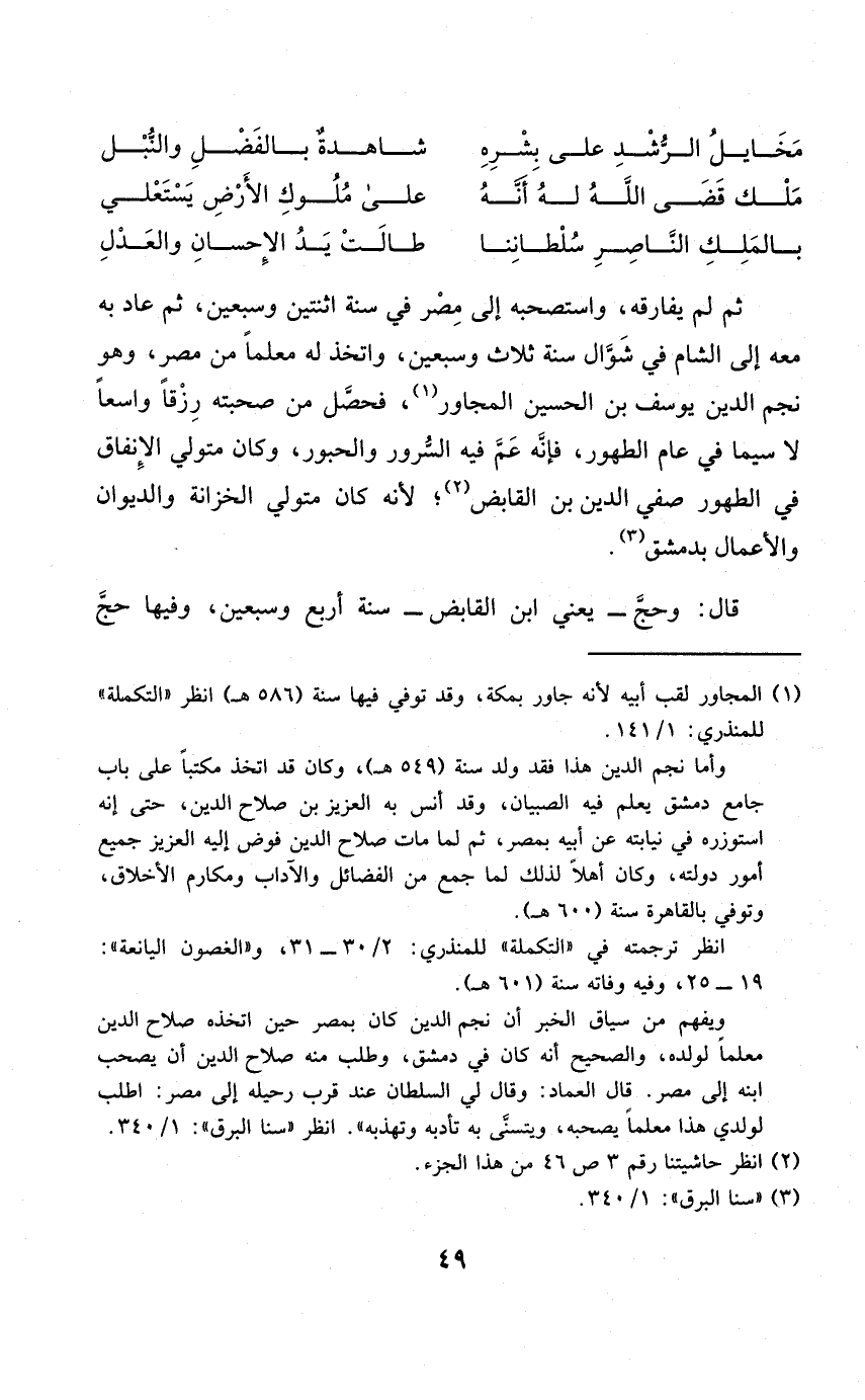 ثمَّ لم يُفَارِقهُ واستصحبه إِلَى مصر فِي سنة اثْنَتَيْنِ وَسبعين ثمَّ عَاد بِهِ مَعَه إِلَى الشَّام فِي شَوَّال سنة ثَلَاث وَسبعين وَاتخذ لَهُ معلما من مصر وَهُوَ نجم الدّين يُوسُف بن الْحُسَيْن المجاور فَحصل من صحبته رزقا وَاسِعًا لَا سِيمَا فِي عَام الطّهُور فَإِنَّهُ عَم فِيهِ السرُور والحبور وَكَانَ مُتَوَلِّي الْإِنْفَاق فِي الطّهُور صفي الدّين بن الْقَابِض لِأَنَّهُ كَانَ مُتَوَلِّي الخزانة والديوان والأعمال بِدِمَشْق