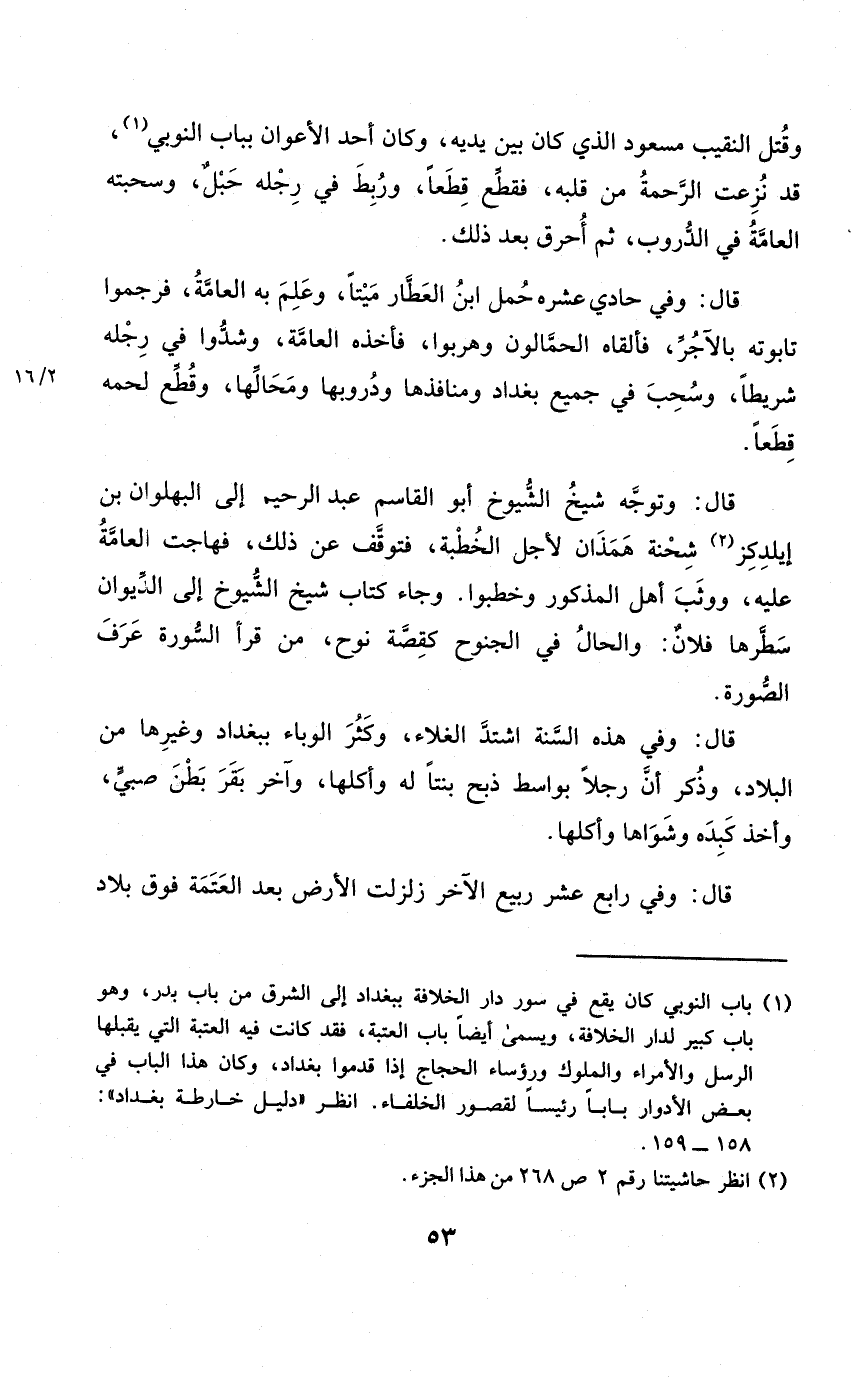 قَالَ وَفِي هَذِه السّنة اشْتَدَّ الغلاء وَكثر الوباء بِبَغْدَاد وَغَيرهَا من الْبِلَاد وَذكر أَن رجلا بواسط ذبح بِنْتا لَهُ وأكلها وَآخر بقر بطن صبي وَأخذ كبده وشواها وأكلها
