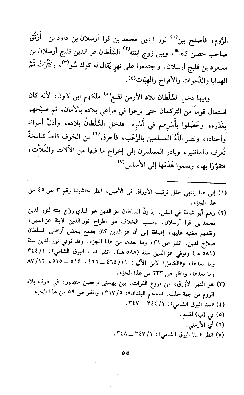 الرّوم فَأصْلح بَين نور الدّين مُحَمَّد بن قَرَأَ أرسلان بن دَاوُد بن أرتق صَاحب حصن كيفا وَبَين زوج ابْنَته السُّلْطَان عز الدّين قليج أرسلان بن مَسْعُود بن قليج أرسلان واجتمعوا على نهر يُقَال لَهُ كوك سو وَكَثُرت ثمَّ الْهَدَايَا والدعوات والأفراح والهبات