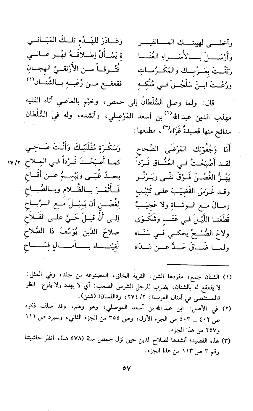 قَالَ وَلما وصل السُّلْطَان إِلَى حمص وخيم بالعاصي أَتَاهُ الْفَقِيه مهذب الدّين عبد الله بن أسعد الْموصِلِي وأنشده وَله فِي السُّلْطَان مدائح مِنْهَا قصيدة غراء مطْلعهَا