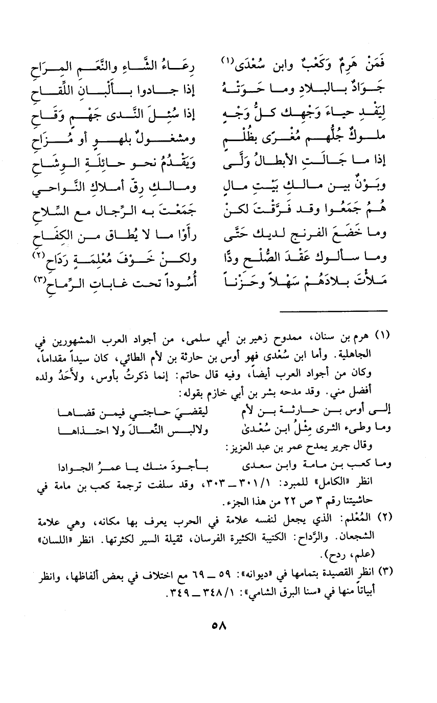 (فَمن هرم وَكَعب وَابْن سعدى ... رعاء الشَّاء وَالنعَم المراح)