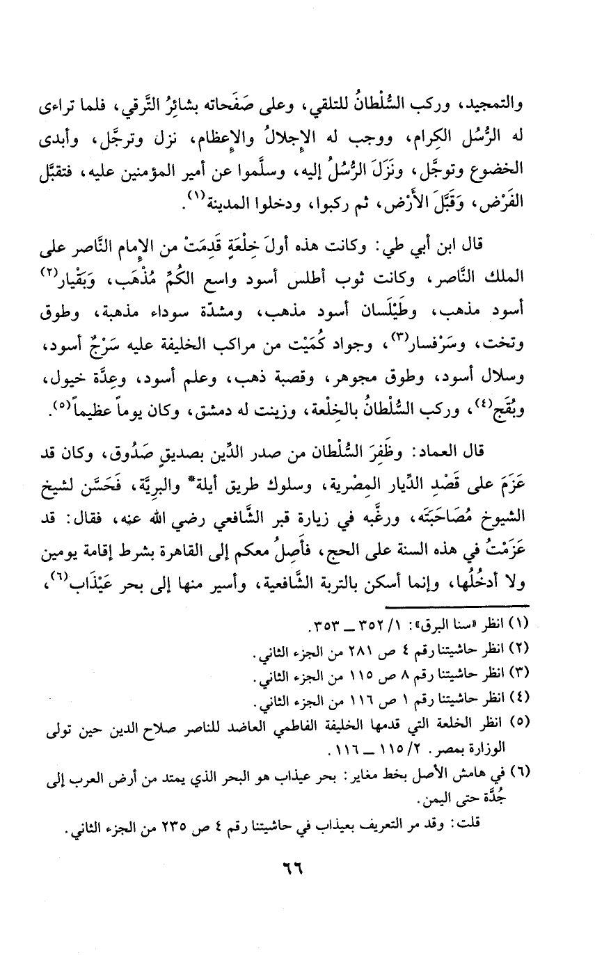 قَالَ ابْن أبي طي وَكَانَت هَذِه أول خلعة قدمت من الإِمَام النَّاصِر على الْملك النَّاصِر وَكَانَت ثوب أطلس أسود وَاسع الْكمّ مَذْهَب وبقيار أسود مَذْهَب وطيلسان أسود مَذْهَب ومشدة سَوْدَاء مذهبَة وطوق وتخت وسرفسار وجواد كميت من مراكب الْخَلِيفَة عَلَيْهِ سرج أسود وسلال أسود وطوق مجوهر وقصبة ذهب وَعلم أسود وعدة خُيُول وبقج وَركب السُّلْطَان بالخلعة وزينت لَهُ دمشق وَكَانَ يَوْمًا عَظِيما