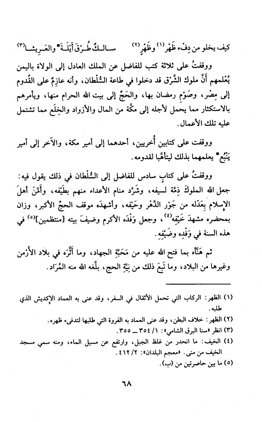 ووقفت على كتاب سادس للفاضل إِلَى السُّلْطَان فِي ذَلِك يَقُول فِيهِ جعل الله الْمُلُوك ذمَّة لسيفه وشرد مَنَام الْأَعْدَاء مِنْهُم بطيفه وَأمن أهل الْإِسْلَام بعدله من جور الدَّهْر وحيفه وأشهده موقف الْحَج الْأَكْبَر وزان بمحضره مشْهد خيفه وَجعل وفده الأكرم وضيف بَيته منتظمين فِي هَذِه السّنة فِي وفده وضيفه