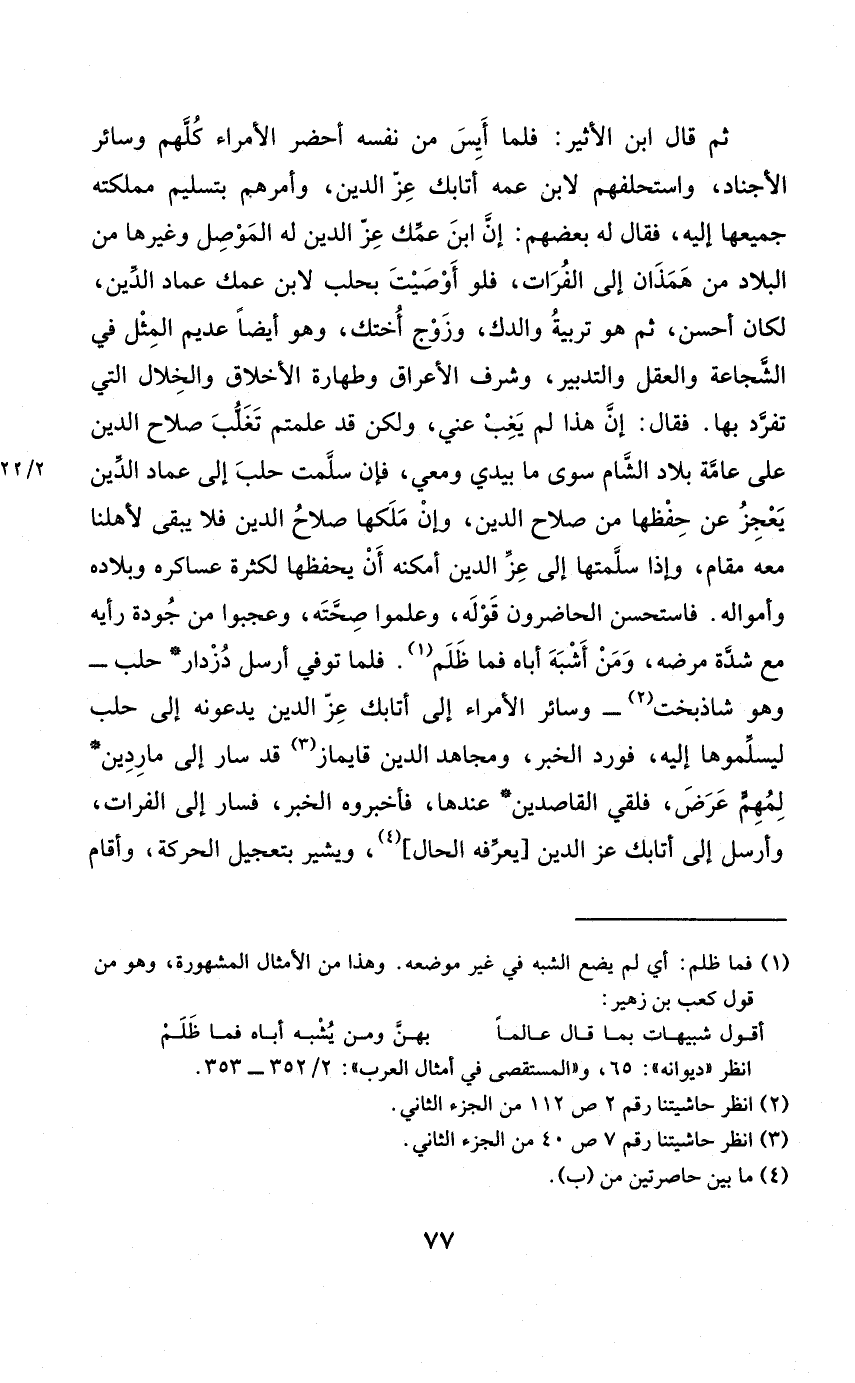 ثمَّ قَالَ ابْن الْأَثِير فَلَمَّا أيس من نَفسه أحضر الْأُمَرَاء كلهم وَسَائِر الأجناد واستحلفهم لِابْنِ عَمه أتابك عز الدّين وَأمرهمْ بِتَسْلِيم مَمْلَكَته جَمِيعهَا إِلَيْهِ فَقَالَ لَهُ بَعضهم إِن ابْن عمك عز الدّين لَهُ الْموصل وَغَيرهَا من الْبِلَاد من همذان إِلَى الْفُرَات فَلَو أوصيت بحلب لِابْنِ عمك عماد الدّين لَكَانَ أحسن ثمَّ هُوَ تربية والدك وَزوج أختك وَهُوَ أَيْضا عديم الْمثل فِي الشجَاعَة وَالْعقل وَالتَّدْبِير وَشرف الأعراق وطهارة الْأَخْلَاق والخلال الَّتِي تفرد بهَا