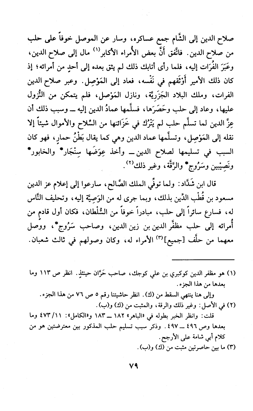 وَعبر صَلَاح الدّين الْفُرَات وَملك الْبِلَاد الجزرية ونازل الْموصل فَلم يتَمَكَّن من النُّزُول عَلَيْهَا وَعَاد إِلَى حلب وحصرها فسلمها عماد الدّين إِلَيْهِ وَسبب ذَلِك أَن عز الدّين لما تسلم حلب لم يتْرك فِي خزائنها من السِّلَاح وَالْأَمْوَال شَيْئا إِلَّا نَقله إِلَى الْموصل وتسلمها عماد الدّين وَهِي كَمَا يُقَال بطن حمَار فَهُوَ كَانَ السَّبَب فِي تَسْلِيمهَا لصلاح الدّين وَأخذ عوضهَا سنجار والخابور ونصيبين وسروج والرقة وَغير ذَلِك