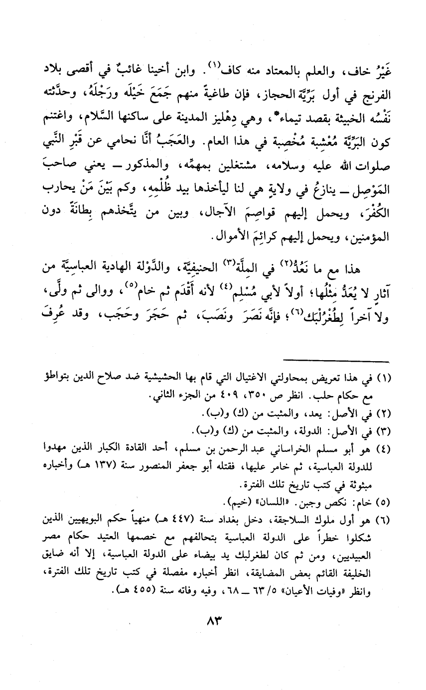هَذَا مَعَ مَا نعد فِي الْملَّة الحنيفية والدولة الهادية العباسية من آثَار لَا يعد مثلهَا أَولا لأبي مُسلم لِأَنَّهُ أقدم ثمَّ خام ووالى ثمَّ ولى وَلَا آخرا لطغرلبك فَإِنَّهُ نصر وَنصب ثمَّ حجر وحجب وَقد عرف