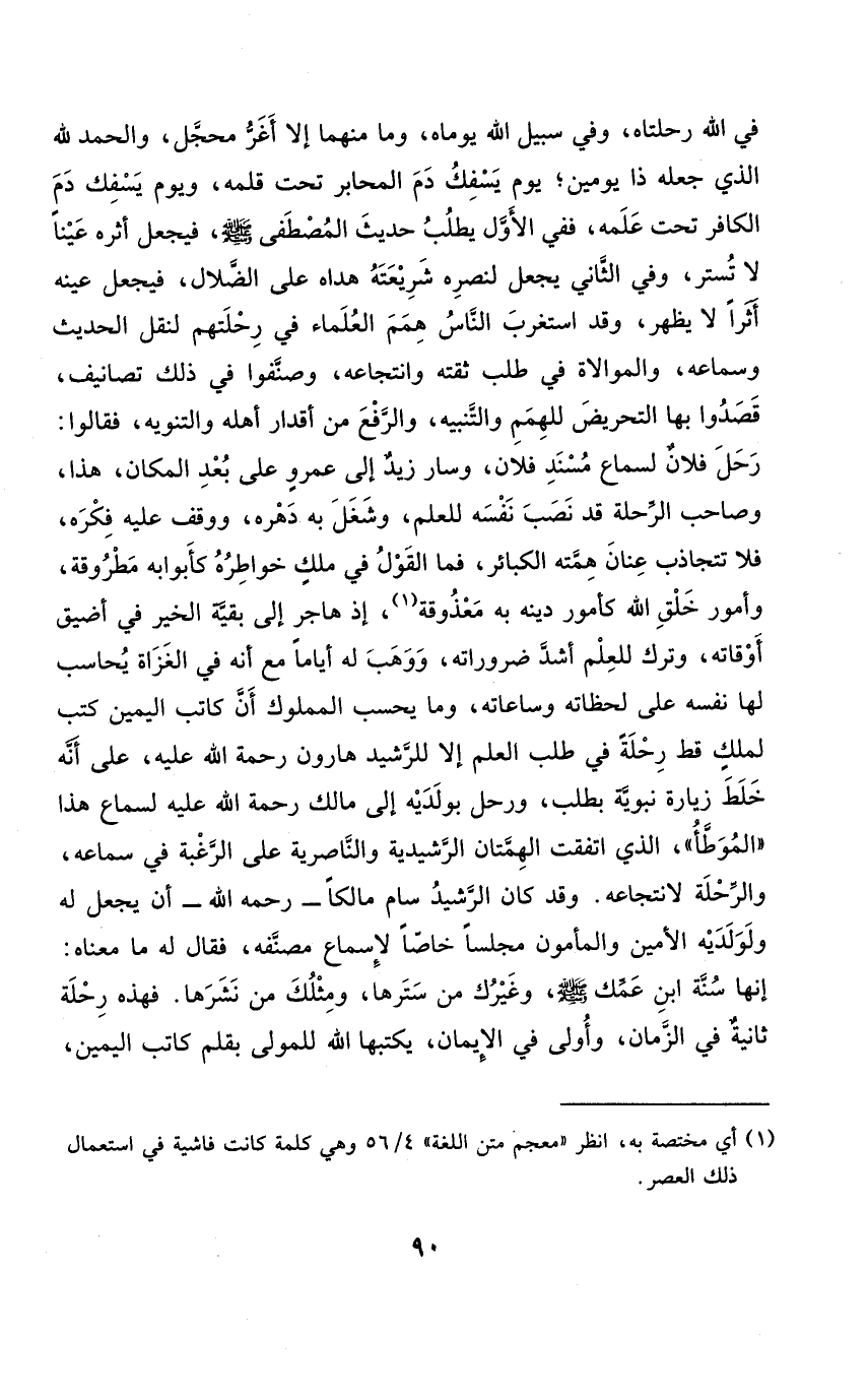 فِي الله رحلتاه وَفِي سَبِيل الله يوماه وَمَا مِنْهُمَا إِلَّا أغر محجل وَالْحَمْد لله الَّذِي جعله ذَا يَوْمَيْنِ يَوْم يسفك دم المحابر تَحت قلمه وَيَوْم يسفك دم الْكَافِر تَحت علمه فَفِي الأول يطْلب حَدِيث الْمُصْطَفى صلى الله عَلَيْهِ وَسلم فَيجْعَل أَثَره عينا لَا تستر وَفِي الثَّانِي يَجْعَل لنصره شَرِيعَته هداه على الضلال فَيجْعَل عينه أثرا لَا يظْهر وَقد اسْتغْرب النَّاس همم الْعلمَاء فِي رحلتهم لنقل الحَدِيث وسماعه والموالاة فِي طلب ثقته وانتجاعه وصنفوا فِي ذَلِك تصانيف قصدُوا بهَا التحريض للهمم والتنبيه وَالرَّفْع من أقدار أَهله والتنويه فَقَالُوا رَحل فلَان لسَمَاع مُسْند فلَان وَسَار زيد إِلَى عَمْرو على بعد الْمَكَان هَذَا وَصَاحب الرحلة قد نصب نَفسه للْعلم وشغل بِهِ دهره ووقف عَلَيْهِ فكره فَلَا تتجاذب عنان همته الْكَبَائِر فَمَا القَوْل فِي ملك خواطره كأبوابه مطروقة وَأُمُور خلق الله كأمور دينه بِهِ معذوقة إِذْ هَاجر إِلَى بَقِيَّة الْخَيْر فِي أضيق أوقاته وَترك للْعلم أَشد ضروراته ووهب لَهُ أَيَّامًا مَعَ أَنه فِي الْغُزَاة يُحَاسب لَهَا نَفسه على لحظاته وساعاته وَمَا يحْسب الْمَمْلُوك أَن كَاتب الْيَمين كتب لملك قطّ رحْلَة فِي طلب الْعلم إِلَّا للرشيد هَارُون رَحْمَة الله عَلَيْهِ على أَنه خلط زِيَارَة نبوية بِطَلَب ورحل بولديه إِلَى مَالك رَحْمَة الله عَلَيْهِ لسَمَاع هَذَا الْمُوَطَّأ الَّذِي اتّفقت الهمتان الرشيدية والناصرية على الرَّغْبَة فِي سَمَاعه والرحلة لانتجاعه
