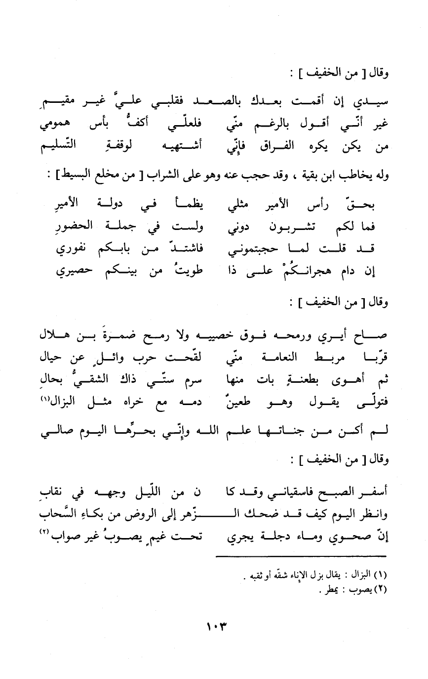 وَله يُخَاطب ابْن بَقِيَّة وَقد حجب عَنهُ وَهُوَ على الشَّرَاب