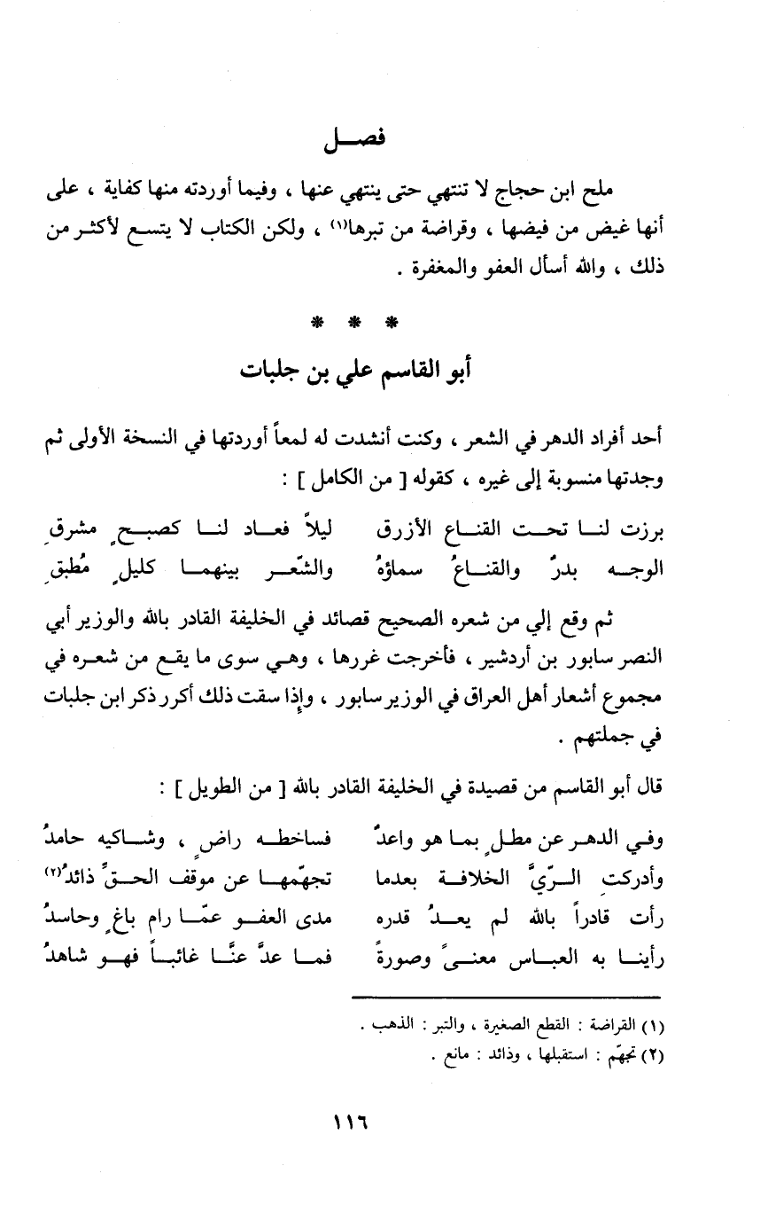 ثمَّ وَقع إِلَيّ من شعره الصَّحِيح قصائد فِي الْخَلِيفَة الْقَادِر بِاللَّه والوزير أبي النَّصْر سَابُور بن أردشير فأخرجت غررها وَهِي سوى مَا يَقع من شعره فِي مَجْمُوع أشعار أهل الْعرَاق فِي الْوَزير سَابُور وَإِذا سقت ذَلِك أكرر ذكر ابْن جلبات فِي جُمْلَتهمْ
