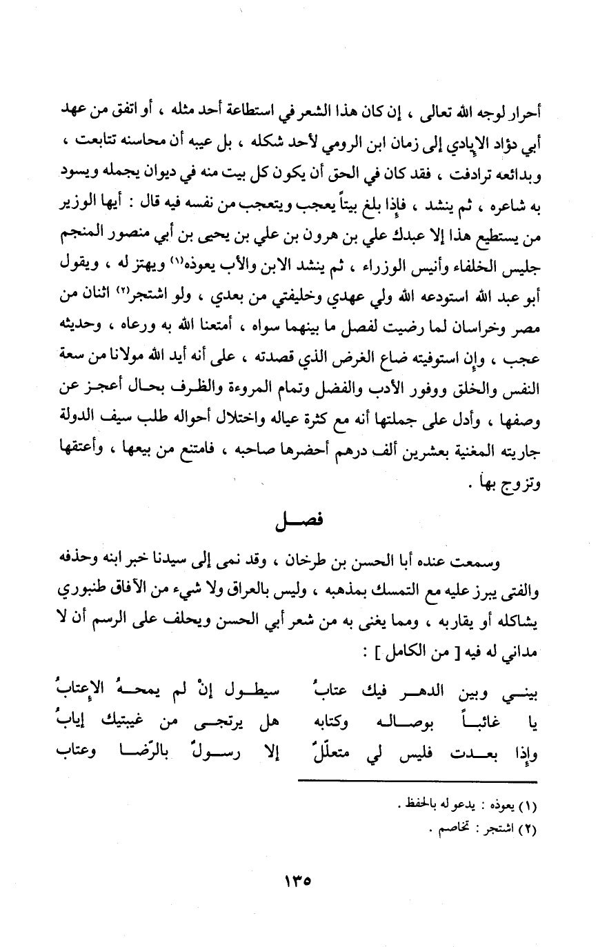 أَحْرَار لوجه الله تَعَالَى إِن كَانَ هَذَا الشّعْر فِي استطاعة أحد مثله أَو اتّفق من عهد أبي دؤاد الْإِيَادِي إِلَى زمَان ابْن الرُّومِي لأحد شكله بل عَيبه أَن محاسنه تَتَابَعَت وبدائعه ترادفت فقد كَانَ فِي الْحق أَن يكون كل بَيت مِنْهُ فِي ديوَان يجلمه ويسود بِهِ شاعره ثمَّ ينشد فَإِذا بلغ بَيْتا يعجب ويتعجب من نَفسه فِيهِ قَالَ أَيهَا الْوَزير من يَسْتَطِيع هَذَا إِلَّا عَبدك عَليّ بن هرون بن عَليّ بن يحيى بن أبي مَنْصُور المنجم جليس الْخُلَفَاء وأنيس الوزراء ثمَّ ينشد الإبن وَالْأَب يعوذه ويهتز لَهُ وَيَقُول أَبُو عبد الله استودعه الله ولي عهدي وخليفتي من بعدِي وَلَو اشتجر اثْنَان من مصر وخراسان لما رضيت لفصل مَا بَينهمَا سواهُ أمتعنا الله بِهِ ورعاه وَحَدِيثه عجب وَإِن اسْتَوْفَيْته ضَاعَ الْغَرَض الَّذِي قصدته على أَنه أيد الله مَوْلَانَا من سَعَة النَّفس والخلق ووفور الْأَدَب وَالْفضل وَتَمام الْمُرُوءَة والظرف بِحَال أعجز عَن وصفهَا وأدل على جُمْلَتهَا أَنه مَعَ كَثْرَة عِيَاله واختلال أَحْوَاله طلب سيف الدولة جَارِيَته الْمُغنيَة بِعشْرين ألف دِرْهَم أحضرها صَاحبه فَامْتنعَ من بيعهَا وأعتقها وَتزَوج بهَا