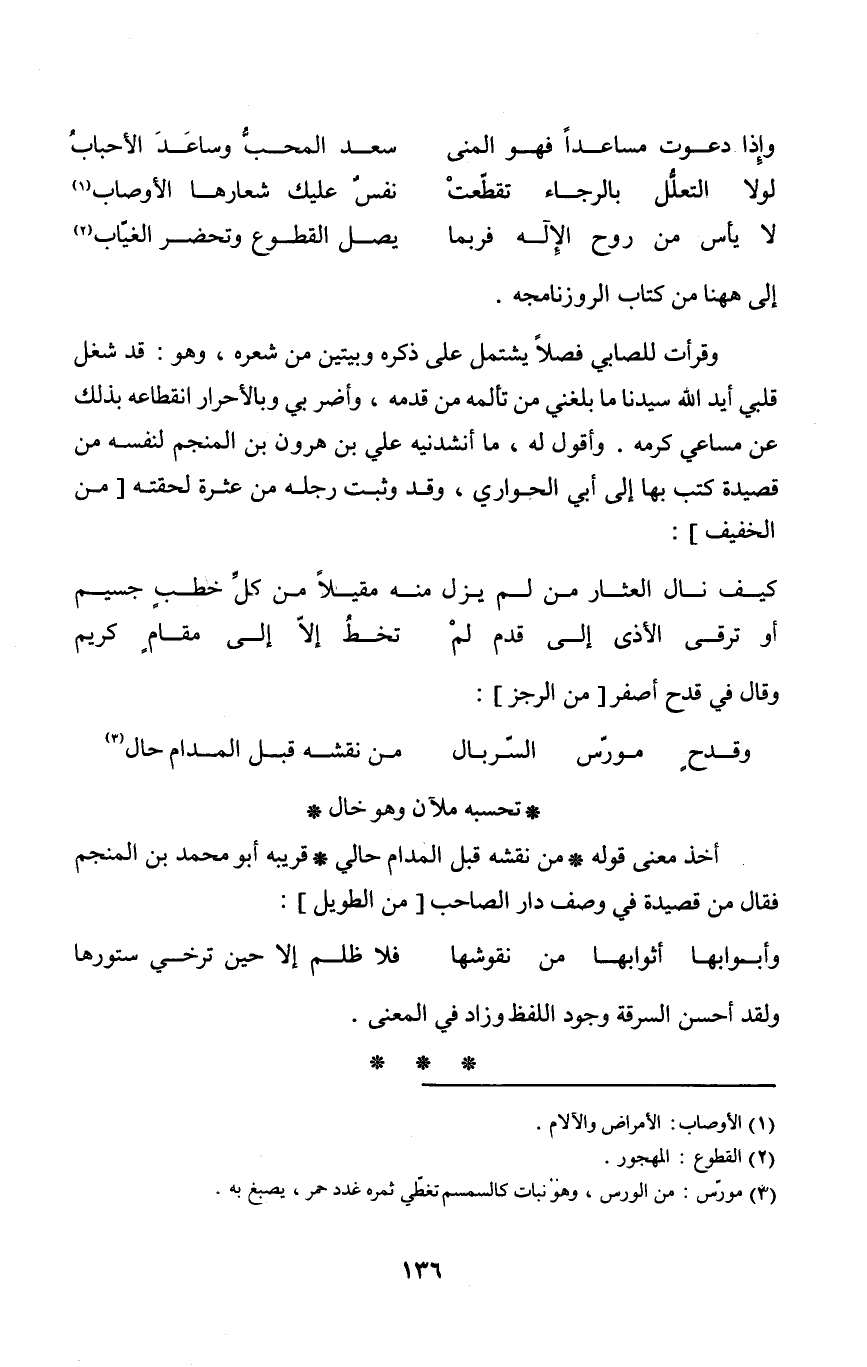 وَأَقُول لَهُ مَا أنشدنيه عَليّ بن هرون بن المنجم لنَفسِهِ من قصيدة كتب بهَا إِلَى أبي الْحوَاري وَقد وَثَبت رجله من عَثْرَة لحقته
