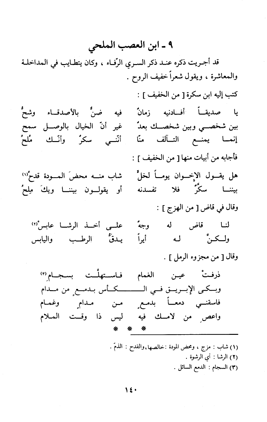 قد أجريت ذكره عِنْد ذكر السّري الرفاء وَكَانَ يتطايب فِي المداخلة والمعاشرة وَيَقُول شعرًا خَفِيف الرّوح