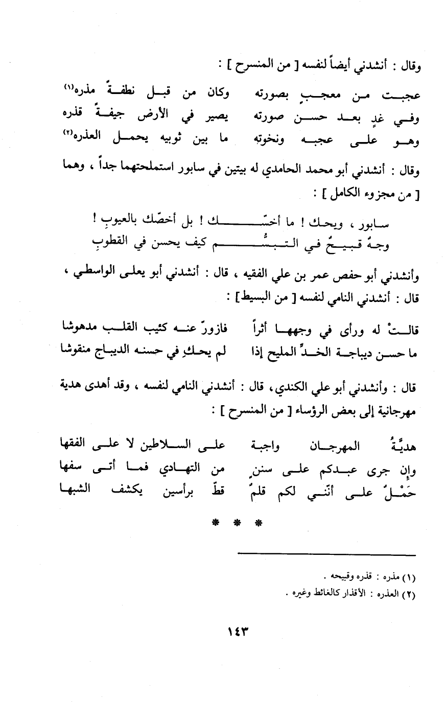وأنشدني أَبُو حَفْص عمر بن عَليّ الْفَقِيه قَالَ أَنْشدني أَبُو يعلى الوَاسِطِيّ قَالَ أَنْشدني النامي لنَفسِهِ
