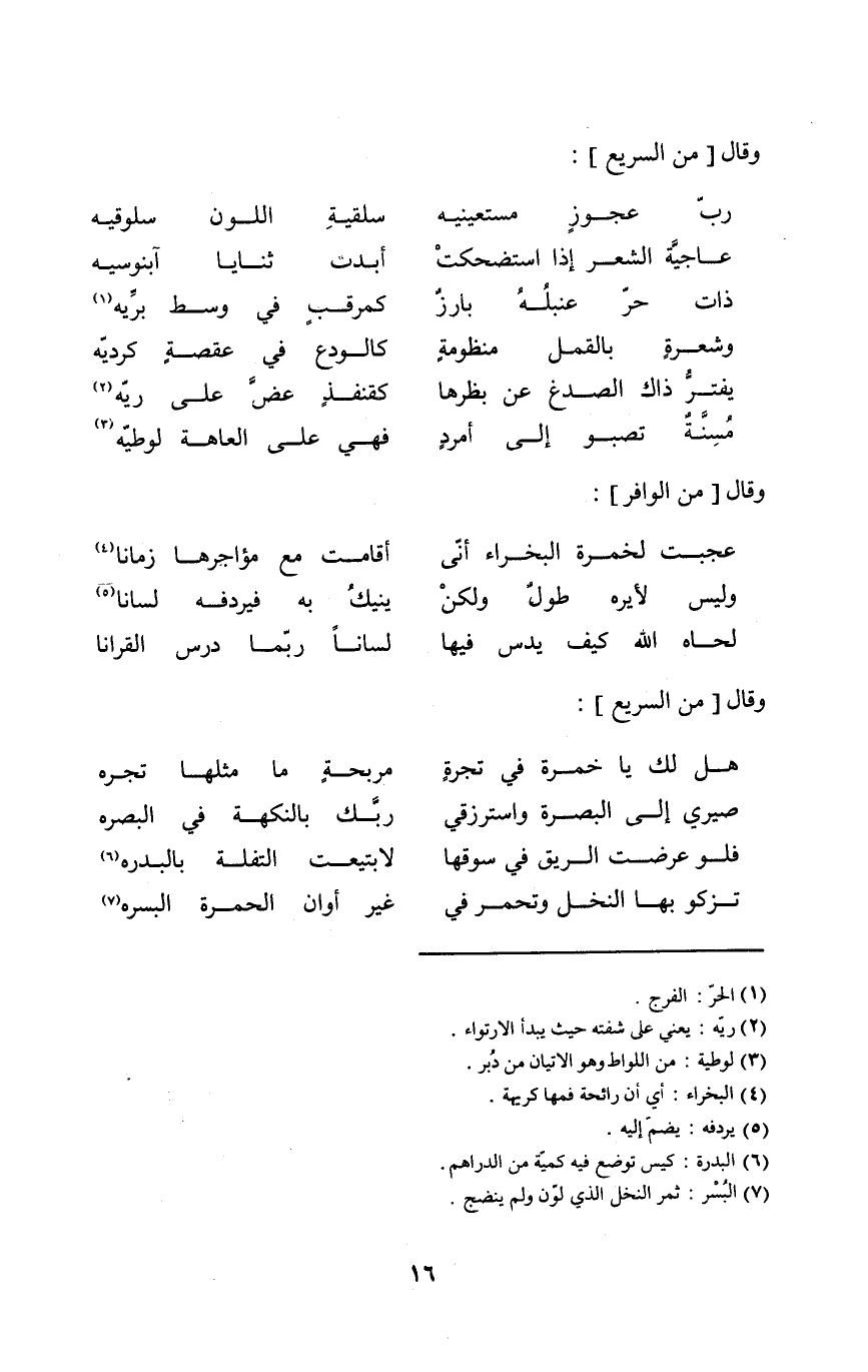 (مُسِنَّة تصبو إِلَى أَمْرَد ... فَهِيَ على العاهة لوطيه) // السَّرِيع //