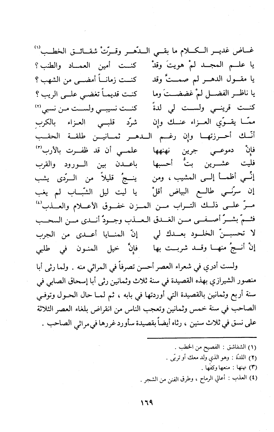 وَلما رثى أَبَا مَنْصُور الشِّيرَازِيّ بِهَذِهِ القصيدة فِي سنة ثَلَاث وَثَمَانِينَ رثى أَبَا إِسْحَاق الصابي فِي سنة أَربع وَثَمَانِينَ بالقصيدة الَّتِي أوردتها فِي بَابه ثمَّ لما حَال الْحول وَتُوفِّي الصاحب فِي سنة خمس وَثَمَانِينَ وتعجب النَّاس من إنقراض بلغاء الْعَصْر الثَّلَاثَة على نسق فِي ثَلَاث سِنِين رثاه أَيْضا بقصيدة سأورد غررها فِي مراثي الصاحب