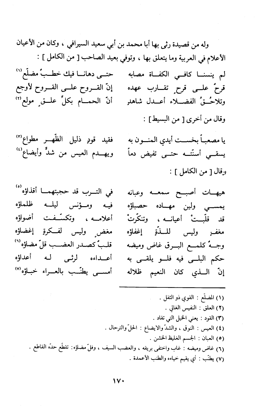 وَله من قصيدة رثى بهَا أَبَا مُحَمَّد بن أبي سعيد السيرافي وَكَانَ من الْأَعْيَان الْأَعْلَام فِي الْعَرَبيَّة وَمَا يتَعَلَّق بهَا وَتُوفِّي بعيد الصاحب