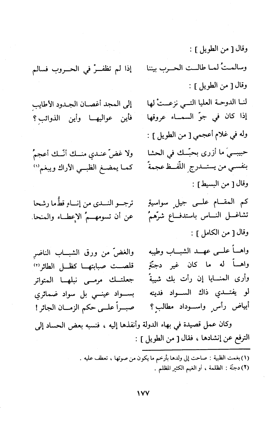 وَكَانَ عمل قصيدة فِي بهاء الدولة وأنفذها إِلَيْهِ فنسبه بعض الحساد إِلَى الترفع عَن إنشادها فَقَالَ