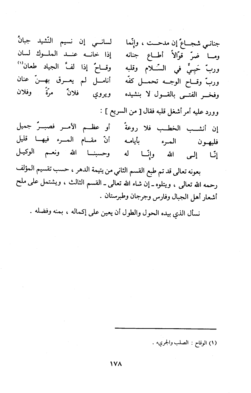 بعونه تَعَالَى قد تمّ طبع الْقسم الثَّانِي من يتيمة الدَّهْر حسب تَقْسِيم الْمُؤلف رَحمَه الله تَعَالَى ويتلوه إِن شَاءَ الله تَعَالَى الْقسم الثَّالِث ويشتمل على ملح أشعار أهل الْجبَال وَفَارِس وجرجان وطبرستان