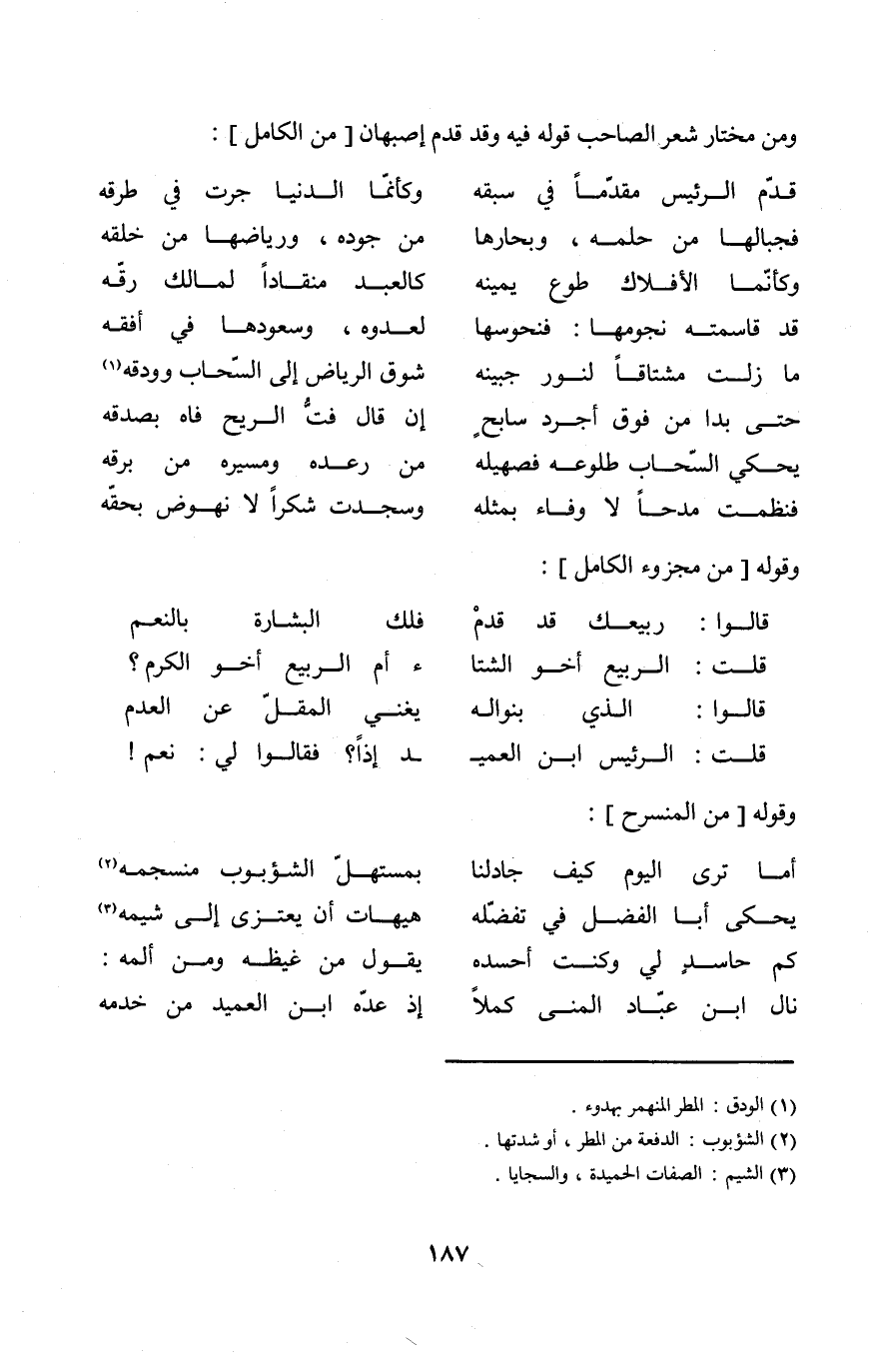 وَمن مُخْتَار شعر الصاحب قَوْله فِيهِ وَقد قدم إصبهان