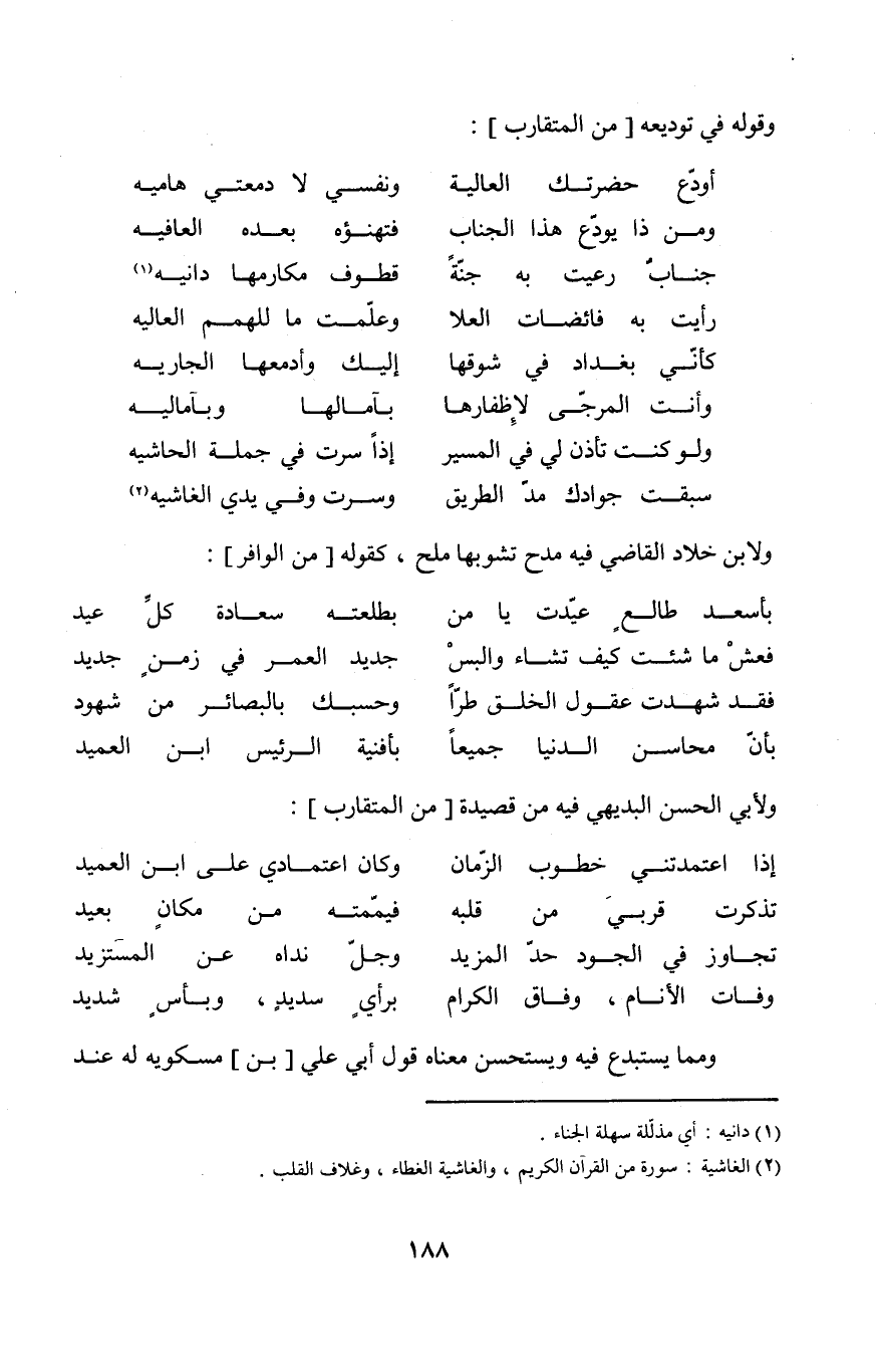 (إِذا اعتمدتني خطوب الزَّمَان ... وَكَانَ اعتمادي على ابْن العميد)