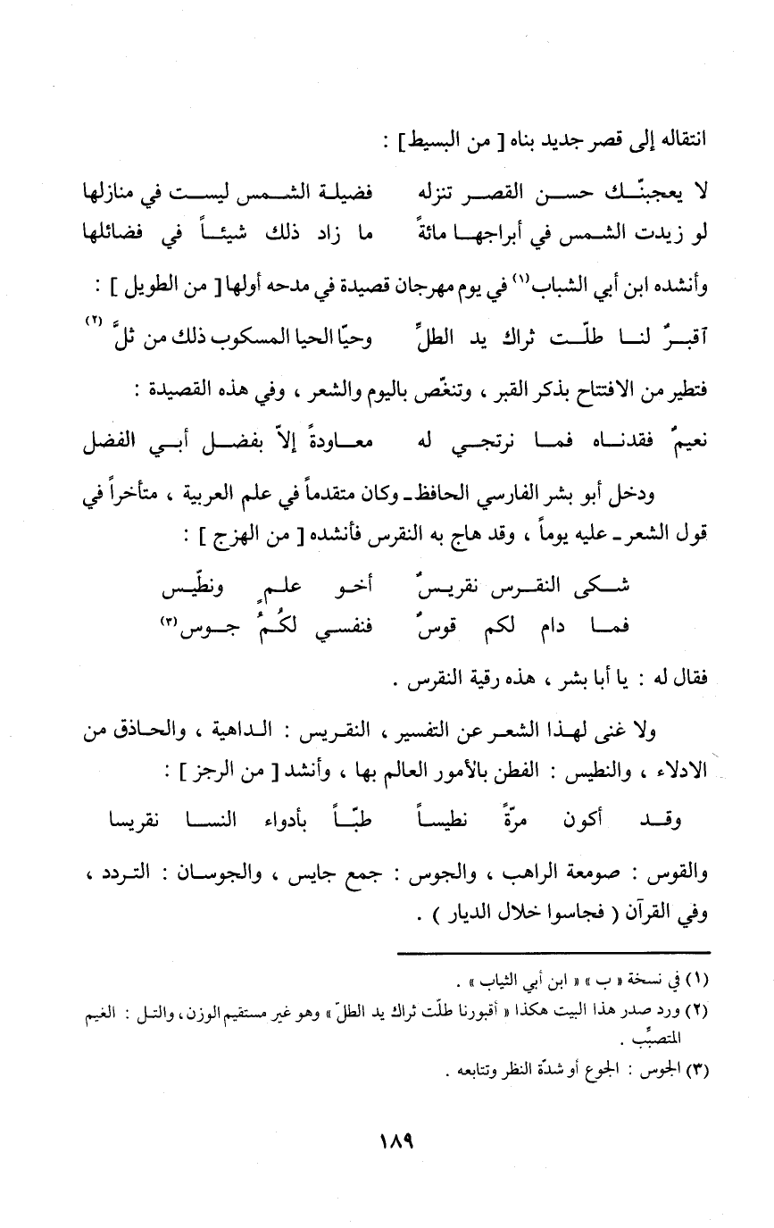 وَلَا غنى لهَذَا الشّعْر عَن التَّفْسِير النقريس الداهية والحاذق من الإدلاء والنطيس الفطن بالأمور الْعَالم بهَا وَأنْشد