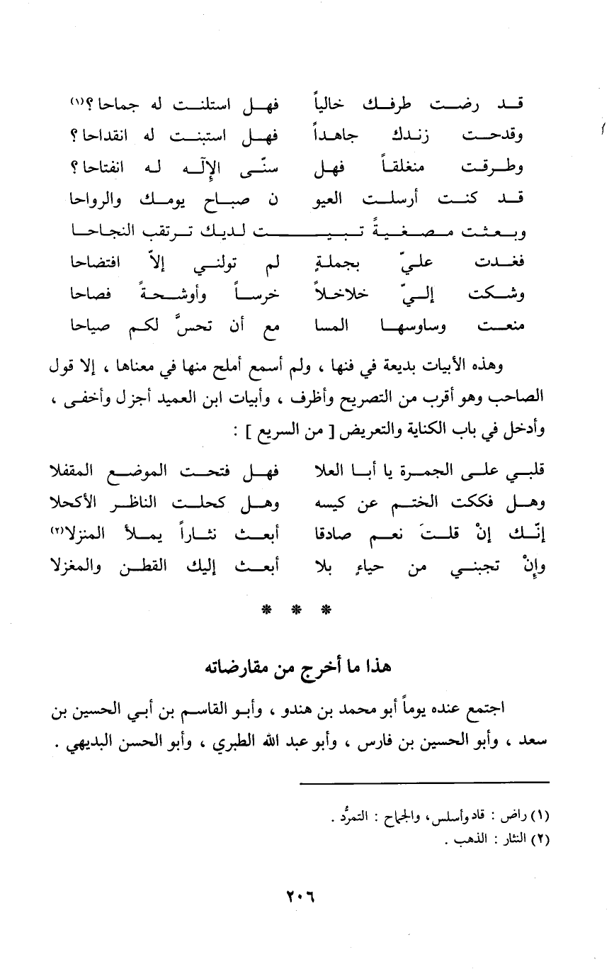 وَهَذِه الأبيات بديعة فِي فنها وَلم أسمع أَمْلَح مِنْهَا فِي مَعْنَاهَا إِلَّا قَول الصاحب وَهُوَ أقرب من التَّصْرِيح وأظرف وأبيات ابْن العميد أجزل وأخفى وَأدْخل فِي بَاب الْكِنَايَة والتعريض