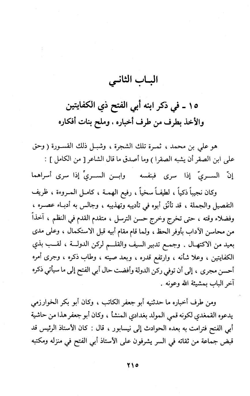 15 - فِي ذكر ابْنه أبي الْفَتْح ذِي الكفايتين وَالْأَخْذ بِطرف من طرف أخباره وملح بَنَات أفكاره